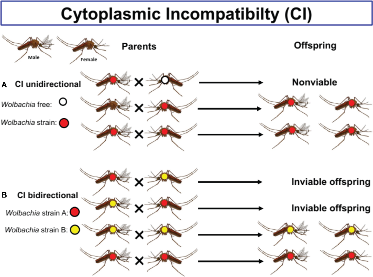 The different types Cytoplasmic Incompatibility (CI) in mosquitoes species. Cytoplasmic incompatibility (CI) prevents infected males from successfully mating with females that lack the same Wolbachia types. (A) Unidirectional CI occurring between Wolbachia infected males and natural uninfected females allows Wolbachia to invade uninfected populations. (B) Bidirectional CI occurring when both reciprocal crosses between males and females infected with different strains of Wolbachia are incompable.