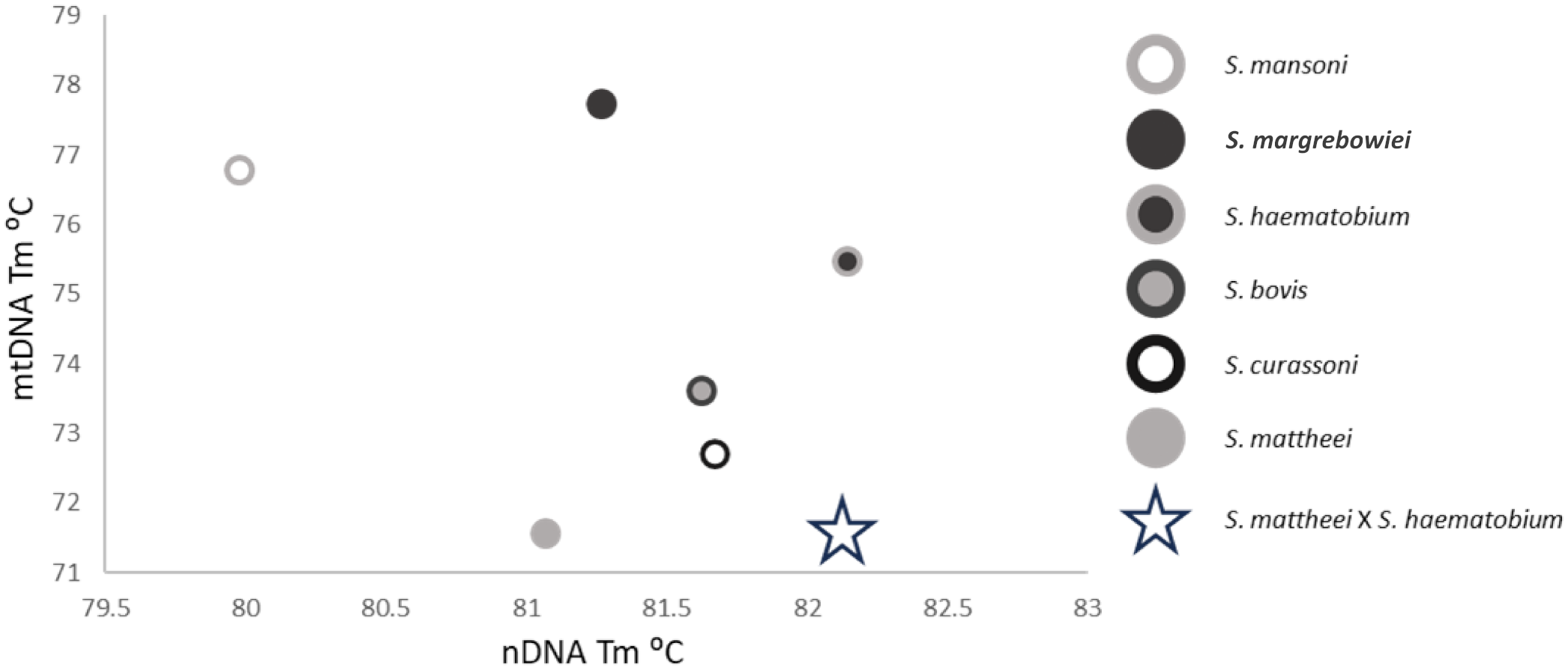 Cross-plot showing the nDNA HRM rtPCR and mtDNA HRM rtPCR Tm positions of the six target species plus a hypothetical S. mattheei x S. haematobium hybrid denoted by the open star. This hybrid has a similar mtDNA Tm to S. mattheei but also an nDNA Tm like that of S. haematobium.