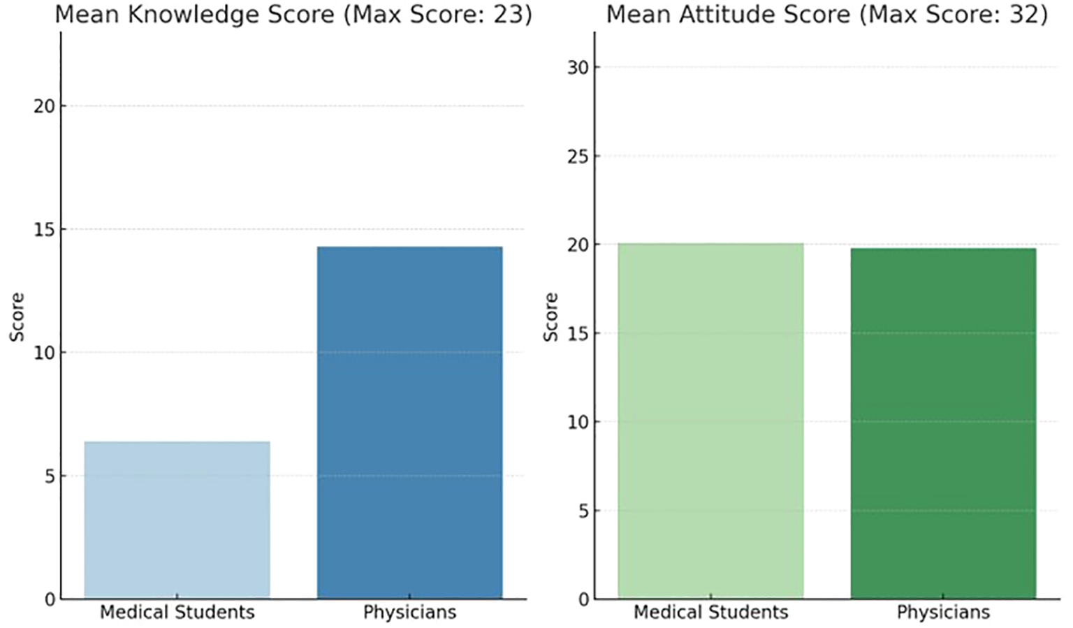 Comparative analysis of mean knowledge and attitude scores among medical students and physicians.