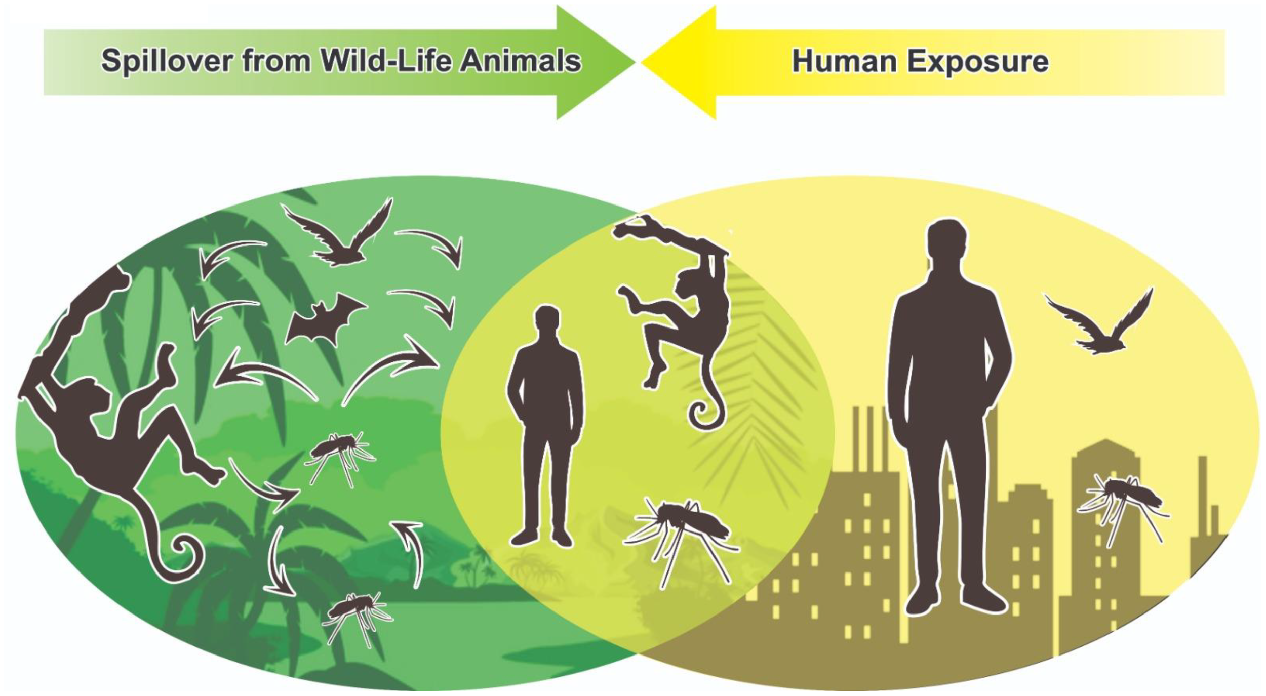 Cities are expanding worldwide their urban areas into fields and forests, increasing human exposure to sylvatic vectors (Figure 3). Thus, protecting the environment and providing vector control are necessary conditions to minimize human exposure to zoonotic spillover.