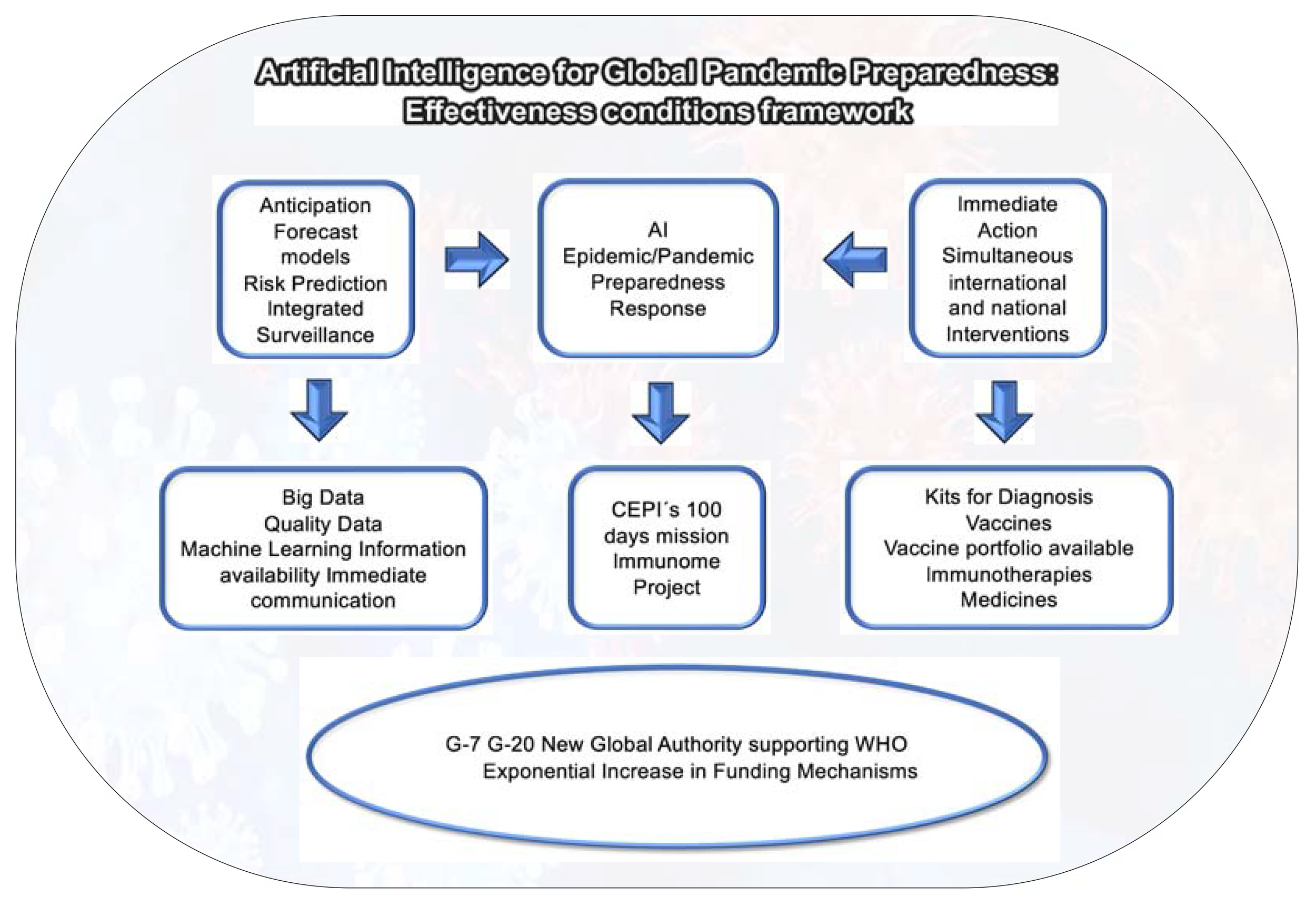 This strategy will require, based on One Health Paradigm and on CEPI´s 100 days vaccine mission, an exponential increase in sustainable funding from multiple stakeholders, including WHO, IMF, the World Bank, G-7, G-20. An International Pandemic Preparedness Authority supporting WHO should be created with these new funding mechanisms for immediate intervention when a new pathogen or emerging disease is identified, avoiding global dissemination. This new Authority supported by a Pandemic Preparedness and Innovation Fund created by international agencies, governments, donors and stakeholders should be able to strengthen and integrate a broad range of scientific and technological collaborations.