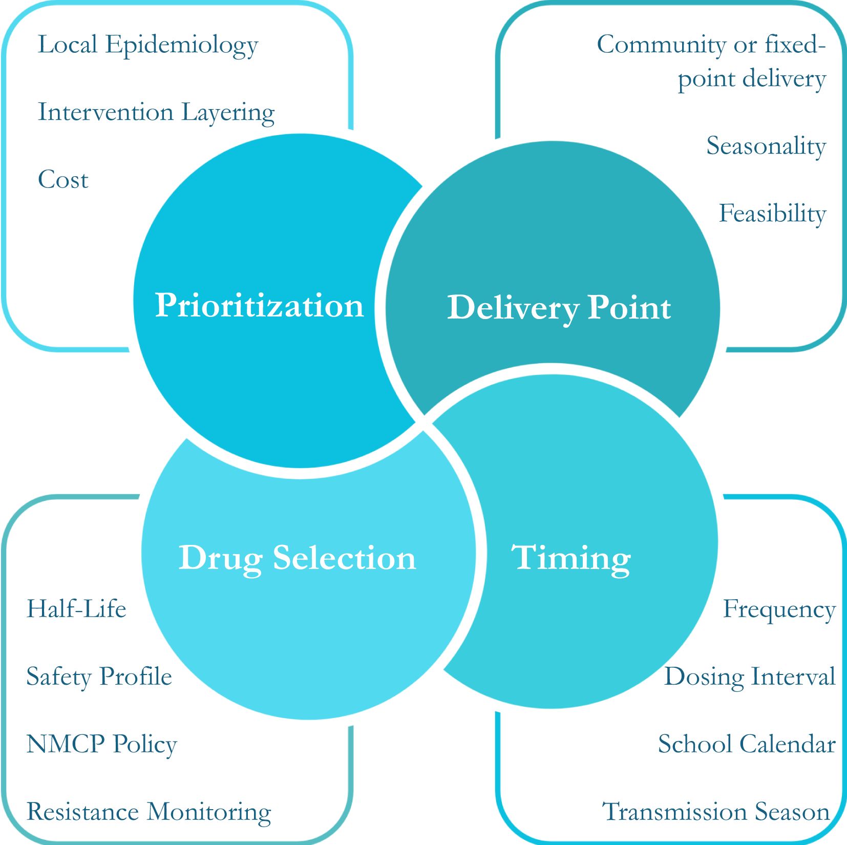 Key considerations for both strategies fall into four core categories: prioritization, timing, delivery point, and drug selection (Figure 1).