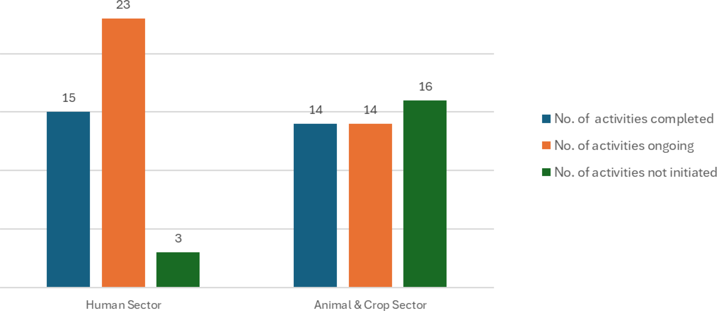 The NASIC-led review of the implementation of the 2017—2022 NAP-AMR showed that of the 85 national-level activities, 29 (34%) were completed, 37 (44%) were ongoing, and 19 (22%) were not initiated. When disaggregated by sector, 93% (38 out of 41) of the activities in human health were either completed or ongoing, compared to 64% (28 out of 44) that were completed or ongoing in the combined animal and crop sectors (Figure 1). These findings show that the implementation of NAP-AMR in the human health sector was more advanced than in the animal/crop sectors.