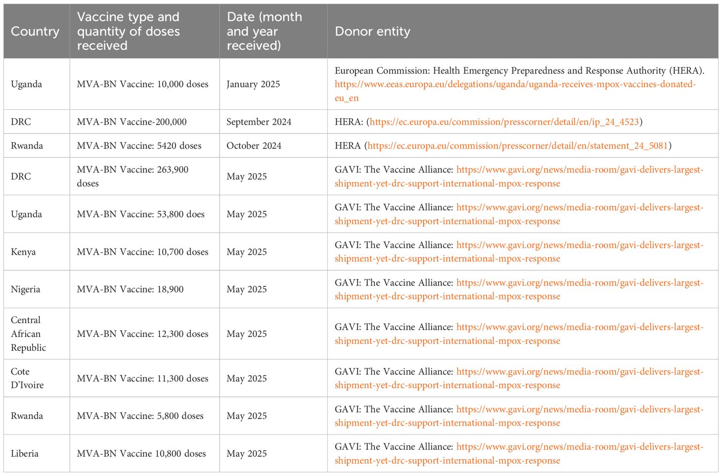 2. WHO. Vaccine doses allocated to 9 African countries hardest hit by mpox surge. Geneva, Switzerland: Joint press release Africa CDC, CEPI, Gavi, UNICEF, WHO (2024). Available online at: https://www.who.int/news/item/06-11-2024-vaccine-doses-allocated-to-9-african-countries-hardest-hit-by-mpox-surge (Accessed April 20, 2025).