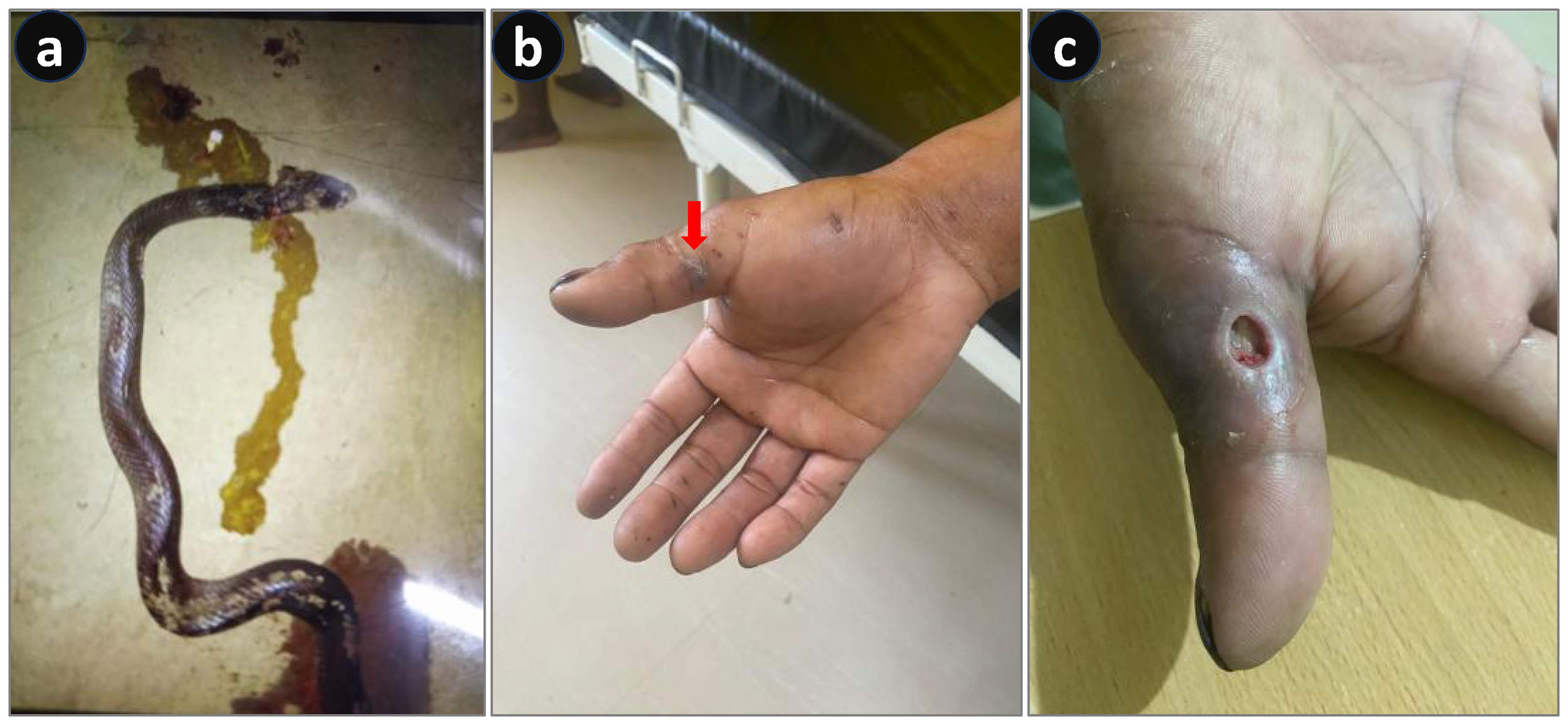 A 45-year-old man encountered a black-colored snake eating chickens in his house at 9:30 p.m. in Sivasagar, Assam. He killed the snake by beheading it, and while trying to discard the body, he was bitten by the snake on his right thumb. The bite was followed by severe pain at the bite site, radiating up to his shoulder. He reported to the nearby community hospital (Demow Rural Community Health Centre, Sivasagar, Assam) at 10:30 p.m. He had multiple episodes of vomiting (five to six times) on the way to the hospital, along with unbearable pain, which was radiating up to his shoulders. Upon initial examination, his pulse rate and blood pressure were observed to be 110/min and 130/80 mmHg. The patient was conscious and responsive to verbal commands. Examination of the bite site revealed blackening of the affected area (Figure 1b). The snake was identified to be a monocled cobra (N. kaouthia) based on the photograph shown (Figure 1a). The attending physician immediately administered 20 vials of polyvalent antivenom intravenously along with a dose of paracetamol (1 g) infusion for pain relief. Magnesium sulfate (MgSO4) glycerin dressing was applied to the wound. Antibiotics, trypsin, and paracetamol infusion were prescribed along with pantoprazole and MgSO4 glycerin dressing. The pain significantly decreased following this treatment. The patient did not develop any symptoms of neurotoxicity. However, the bite resulted in some blebs that were aspirated, followed by sloughing and finally developed in the form of a profound wound. Extensive debridement was performed with hydrogen peroxide and papain-urea ointment, and dressing was continued with Placentrex extract gel over the course of a month (Figure 1c). Upon normalization of all the laboratory parameters on the 20th day, the patient was discharged with a regular follow-up for wound dressing. The wound was completely healed without any residual effect on the 40th day.