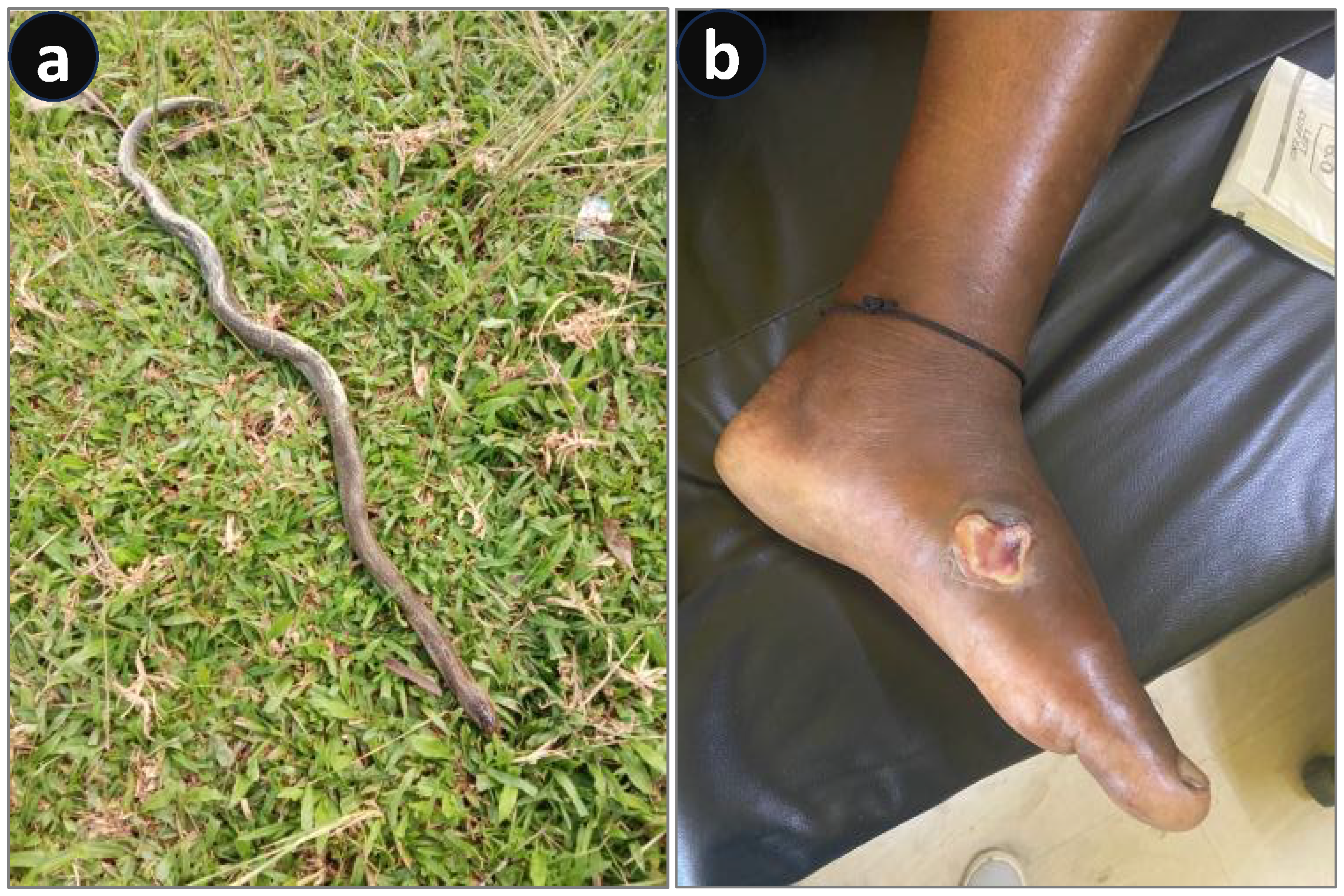 Envenoming by a dead monocled cobra (Naja kaouthia). (a) Photograph of a dead snake. (b) Bite area showing tissue necrosis.