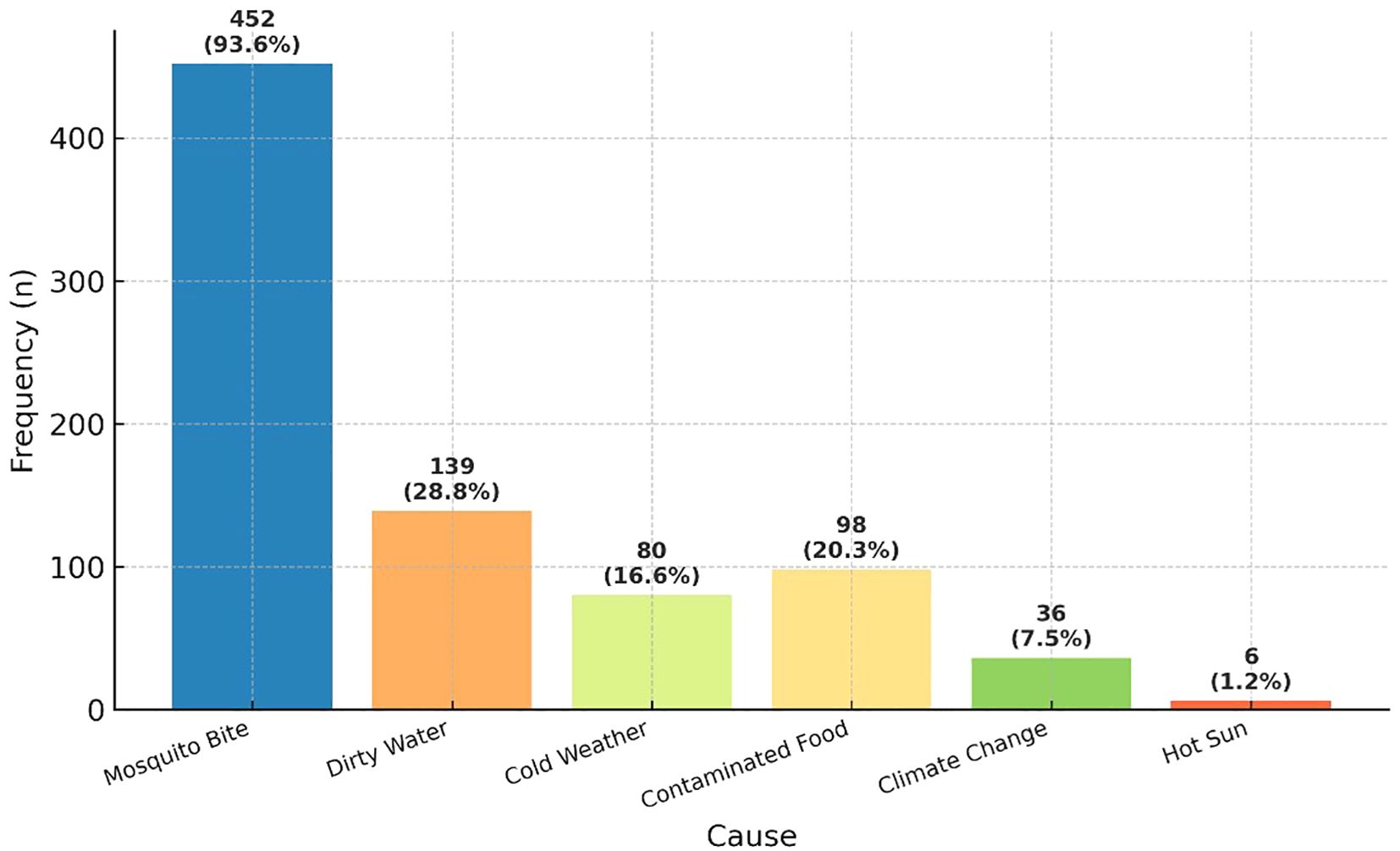 Malaria awareness was nearly universal, with 98.0% (n=475/483) of participants reporting familiarity with the disease. The majority (93.6%, n=452/483) correctly identified mosquito bites as the primary cause, though misconceptions persisted—28.8% (n=139) cited dirty water and 20.3% (n=98) contaminated food as possible causes (Figure 1).