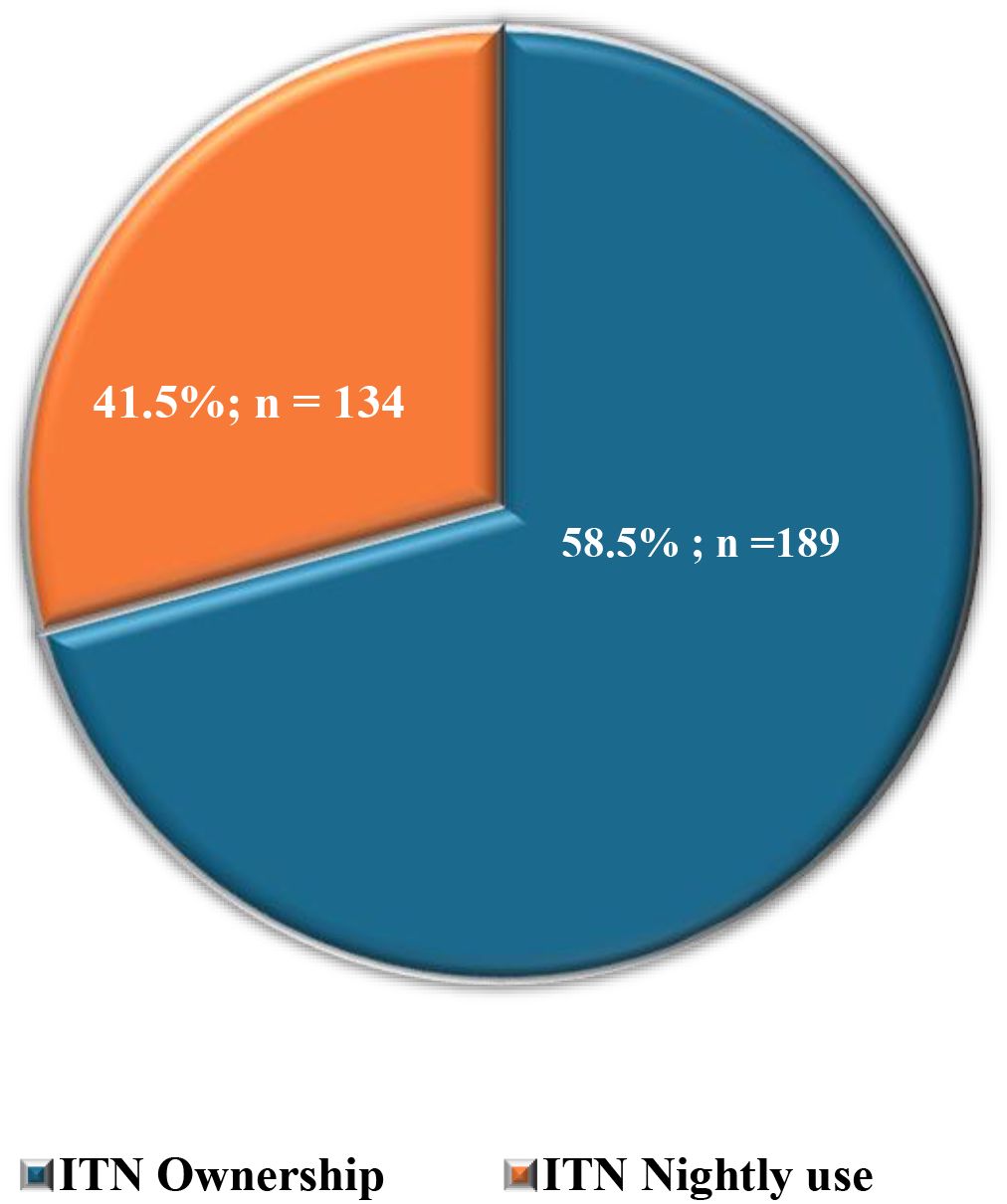 For malaria prevention practices, where participants could “select all that apply,” insecticide-treated net (ITN) ownership was most frequently reported (66.9%, n=323/483), followed by repellent use (60.5%, n=292/483), insecticide spraying (50.7%, n=245/483), and clearing stagnant water (49.5%). Less common measures included wearing protective clothing (28.2%) and using traditional methods (2.9%), while 4.6% reported taking no preventive action (Table 3). Among ITN owners (n=323), only 41.5% (n=134/323) reported using them nightly (Figure 3). Percentages exceed 100% due to multiple responses.