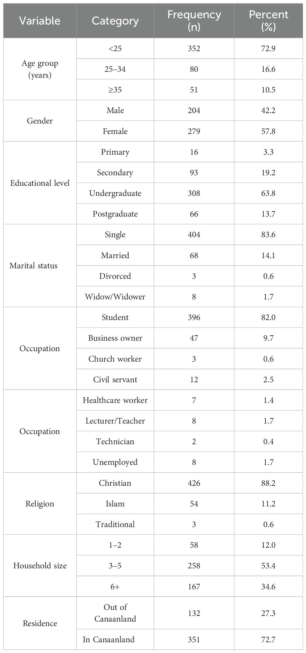 Methods: A cross-sectional study was conducted between March and June 2025 among 483 residents of Canaanland, a semi-urban religious and educational community. Data were collected anonymously using semi-structured questionnaires in both hardcopy and KoboToolbox formats, with manual entry for paper responses. Descriptive analysis was performed using R software (version 4.3.1).