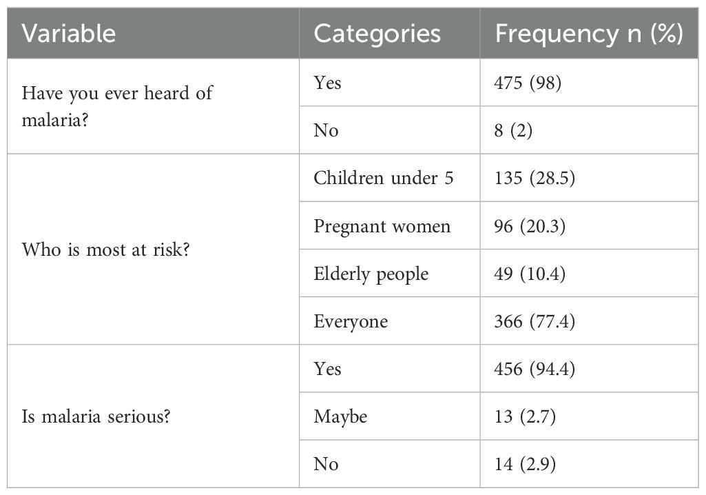 When asked about at-risk groups, most participants (77.4%) recognized that malaria affects everyone, though a considerable proportion specifically mentioned children under five (28.5%) and pregnant women (20.3%). Nearly all respondents (94.4%) considered malaria a serious illness (Table 2).