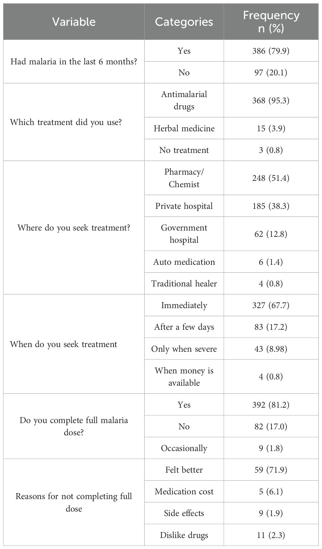 Treatment-seeking behavior in this region often includes both formal and informal pathways, with many individuals relying on self-medication and roadside chemists due to concerns about cost, convenience, and mistrust of formal healthcare systems (13–15). These practices have contributed to suboptimal treatment adherence, further complicating malaria control and increasing the risk of drug resistance. Hospital-based diagnosis, associated with higher adherence rates, underscores the importance of strengthening access to formal healthcare in these semi-urban communities (13).
