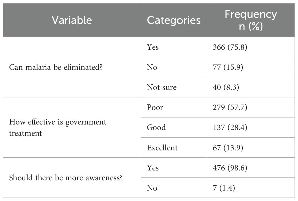 Evaluating how the Community dwellers perceive malaria, most respondents believed that malaria can be eliminated (75.8%), though 15.9% disagreed and 8.3% were unsure. Over half (57.7%) rated government control efforts as poor, while only 13.9% rated them as excellent. However, almost all participants (98.6%) strongly agree on the need for increased community awareness outreaches and sensitization. These findings are summarized in Table 7.