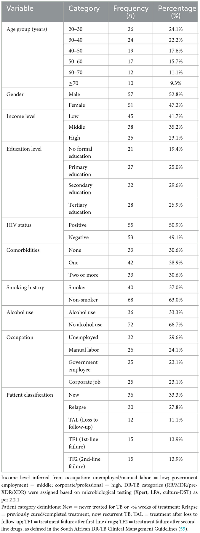The study population comprised all patients diagnosed with DR-TB and receiving treatment at selected high-burden rural clinics in the rural Eastern Cape between January 2018 and December 2020 (N = 450). A total of 108 patients were included using proportionate stratified sampling, ensuring representation across age groups, gender, and patient categories (new, relapse, TAL, TF1, TF2). The sample size (n = 108) was determined using the finite population correction formula for a known population (N = 450), assuming an expected adherence prevalence of 24% from prior literature, a 95% confidence level (Z = 1.96), and a precision (margin of error) of 5%. This yielded a minimum required sample size of 108 patients, which was then proportionately stratified by age, gender, and patient category to ensure representativeness of the study population. While the sample reflects the demographic and clinical composition of DR-TB patients in the participating clinics, the representativeness is limited to similar rural, high-burden settings within the rural Eastern Cape. As income data were not directly available, occupational categories served as socioeconomic proxies, which may limit comparability to other regions. Inclusion criteria were diagnosis of DR-TB between January 2018 and December 2020 at one of the participating high-burden rural clinics in the Eastern Cape; initiation on a standardized DR-TB treatment regimen; and availability of complete treatment records for the study period. Exclusion criteria included transfer out before treatment completion, loss to follow-up within the first month of treatment, incomplete or missing clinical/socioeconomic data, and being < 18 years of age. From the eligible population, a proportionate stratified sampling approach was used to ensure representation across age, gender, and DR-TB patient categories. While the sample reflects the composition of DR-TB patients in this rural setting, the findings may not be directly generalized to urban or low-burden regions.