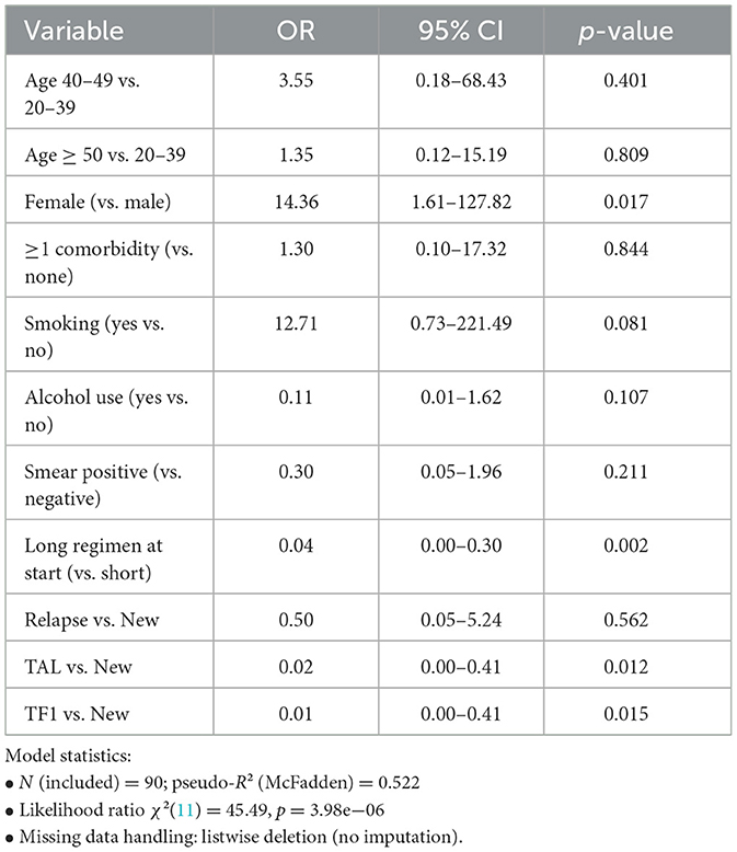 In Table 2, sex (OR = 14.36; 95% CI: 1.61–127.82; p = 0.017) and short regimen at start (reference; long regimen at start associated with lower odds of adherence: OR = 0.04; 95% CI: 0.00–0.30; p = 0.002) were significant. TAL (vs. New) (OR = 0.02; 95% CI: 0.00–0.41; p = 0.012) and TF1 (vs. New) (OR = 0.01; 95% CI: 0.00–0.41; p = 0.015) showed lower odds of adherence. Other covariates were not statistically significant in this specification. Reference categories included male, no comorbidity, non-smoker, no alcohol use, smear-negative, short regimen at start, age 20–39, and new patient category.