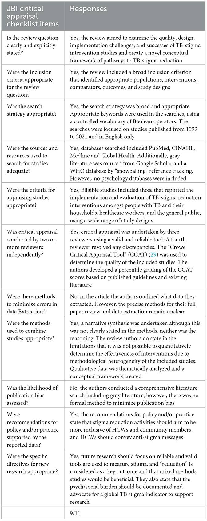 Nuttall et al. (10) included studies that reported the implementation and evaluation of TB-stigma reduction interventions amongst people with TB and their households, healthcare workers (HCWs) and the public. This included a wide range of study designs, with all studies importantly measuring TB-stigma. The Joanna Briggs Institute critical appraisal tool for systematic review and research synthesis (12) was used to appraise Nuttall et al. (10). The appraisal purpose was to assess methodological quality and the possibility of bias in design, conduct, and analysis of this review; following an independent process and consensus discussion two of the 11 criteria were not achieved (Table 1).