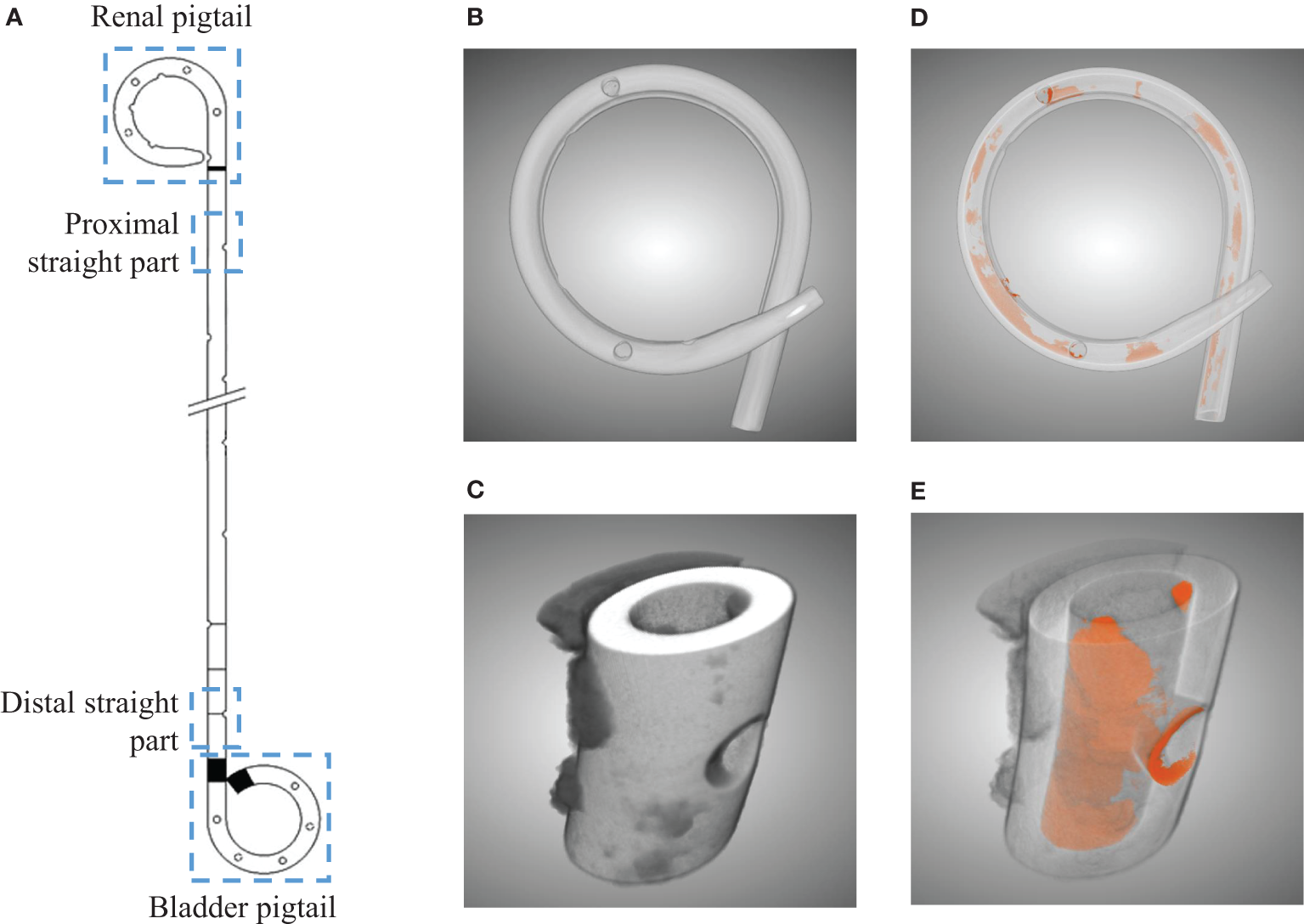 Illustration of the four separated sections from a ureteral stent (A). Three dimensional µ-CT images from the pigtail and straight part before (B, C) and after (D, E) segmentations, respectively. Luminal encrustations from the segmentation results are shown in orange, where stents are rendered semi-transparent for better visualization.