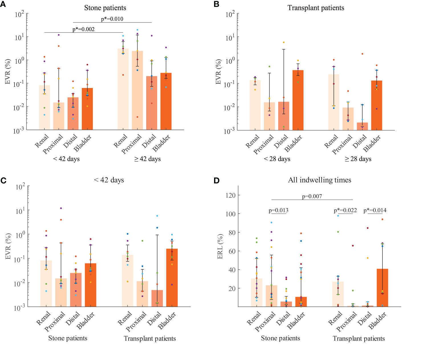 Encrustation volume ratios (EVR) compared with respect to indwelling time for stone patients (A) and transplant patients (B). (C) EVR compared between patient groups with stent indwelling time < 42 days. (D) Encrustation risk levels (ERL) from stone and transplant patients for each stent section. The median (bar) and interquartile range (error bars) are presented. Raw data from the same stent are coded by color (filled circles). P-values corrected by the Bonferroni-Holm method is indicated by the asteroid (*). Further data can be found in the Supplementary Material.