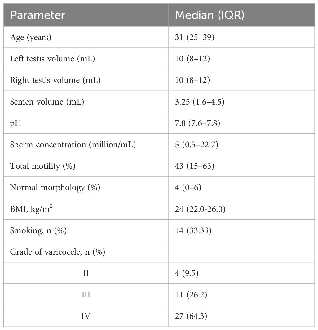 We enrolled 42 patients with a median age of 31.5 years (IQR, 25–39). Of these, 33.3% were smokers, 7% had hypercholesterolemia, and 7% had a history of surgery for cryptorchidism or hypospadias. Most patients had grade IV (53.85%) or grade III (34.62%) left-sided varicocele according to the Sarteschi classification. The median abstinence interval was 3 days (IQR, 2–4).