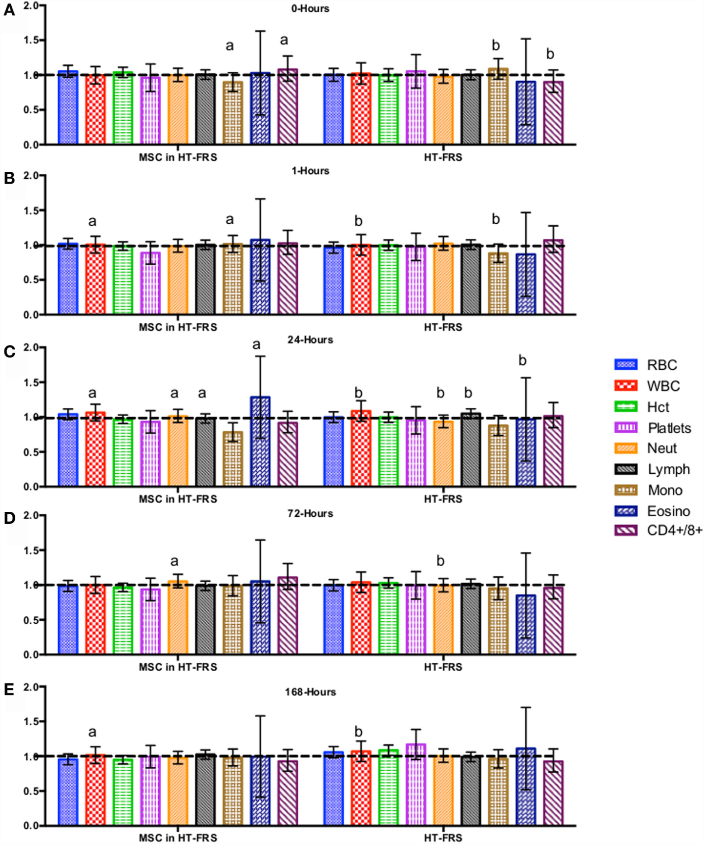 Percent difference from pre-injection measurements (black dotted line) of complete blood count (A) 0 h, (B) 1 h, (C) 24 h (D) 72 h, (E) 168 h following intravenous injection of 5 × 107 pooled allogeneic CB-MSC derived from five horses. 10 mL HypoThermosol® (HTS-FRS) control. Error bars represent 95% confidence interval. Different letters indicate statistical differences between treatment and control groups for a specific parameter.