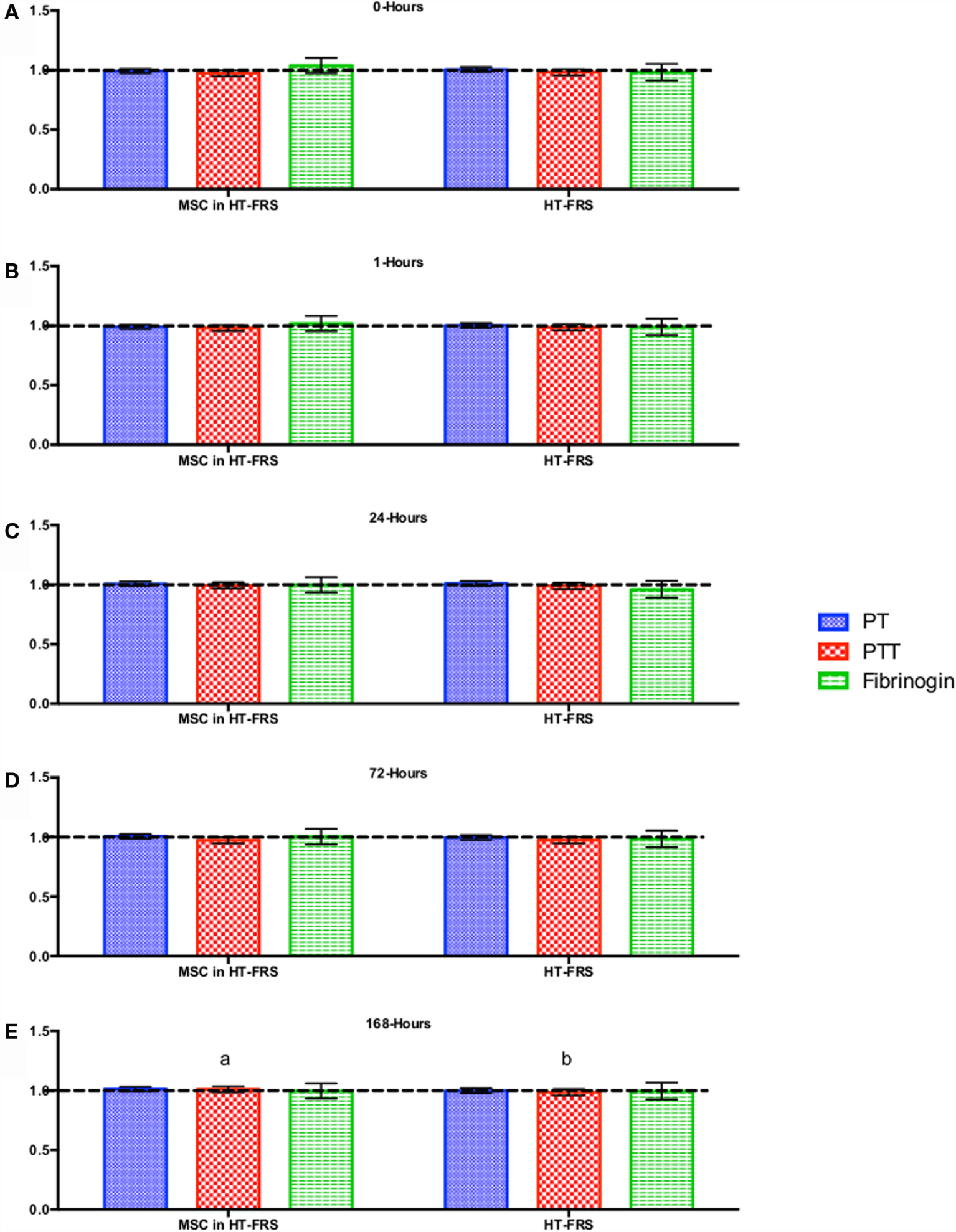 Percent difference from pre-injection measurements (black dotted line) of coagulation profile (A) 0 h, (B) 1 h, (C) 24 h (D) 72 h, (E) 168 h following intravenous injection of 5 × 107 pooled allogeneic CB-MSC derived from five horses. 10 mL HypoThermosol® (HTS-FRS) control. Error bars represent 95% confidence interval. Different letters indicate statistical differences between treatment and control groups for a specific parameter.
