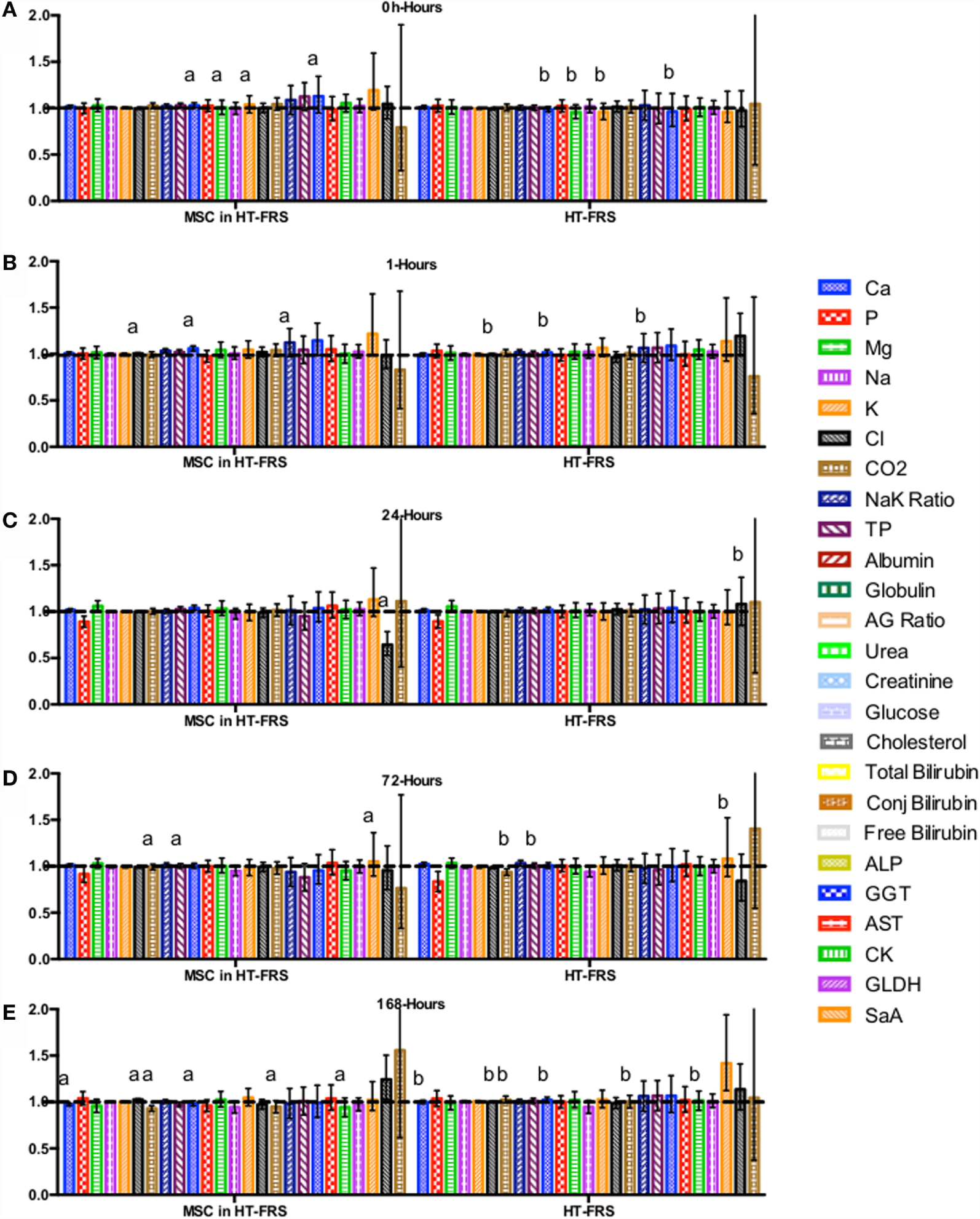 Percent difference from pre-injection measurements (black dotted line) of biochemistry profile (A) 0 h, (B) 1 h, (C) 24 h (D) 72 h, (E) 168 h following intravenous injection of 5 × 107 pooled allogeneic CB-MSC derived from five horses. 10 mL HypoThermosol® (HTS-FRS) control. Error bars represent 95% confidence interval. Different letters indicate statistical differences between treatment and control groups for a specific parameter.