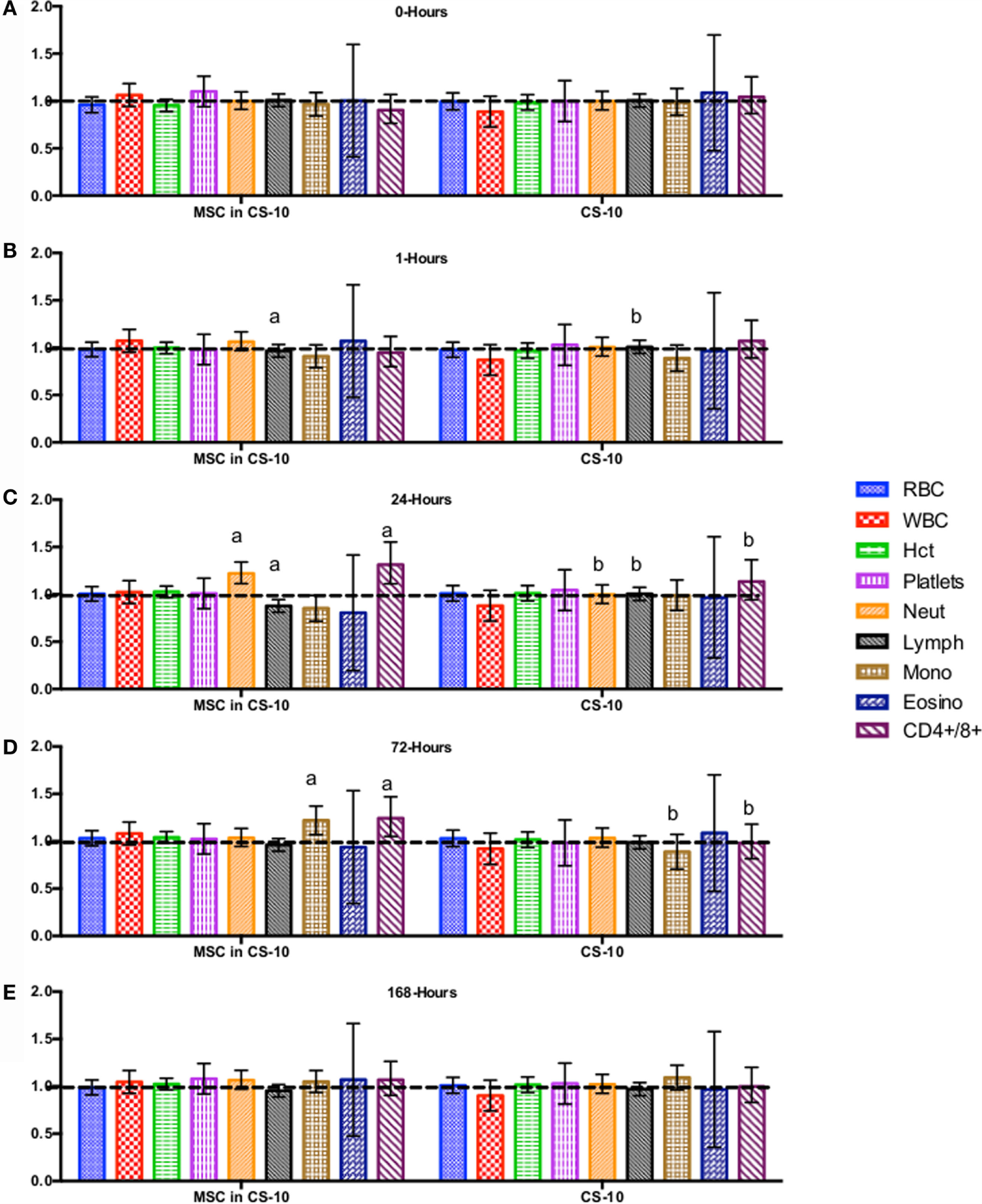 Percent difference from pre-injection measurements (black dotted line) of complete blood count (A) 0 h, (B) 1 h, (C) 24 h (D) 72 h, (E) 168 h following intravenous injection of 5 × 107 pooled allogeneic CB-MSC derived from 5 horses. 10 mL CryoStor® CS10 (CS10) control. Error bars represent 95% confidence interval. Different letters indicate statistical differences between treatment and control groups for a specific parameter.