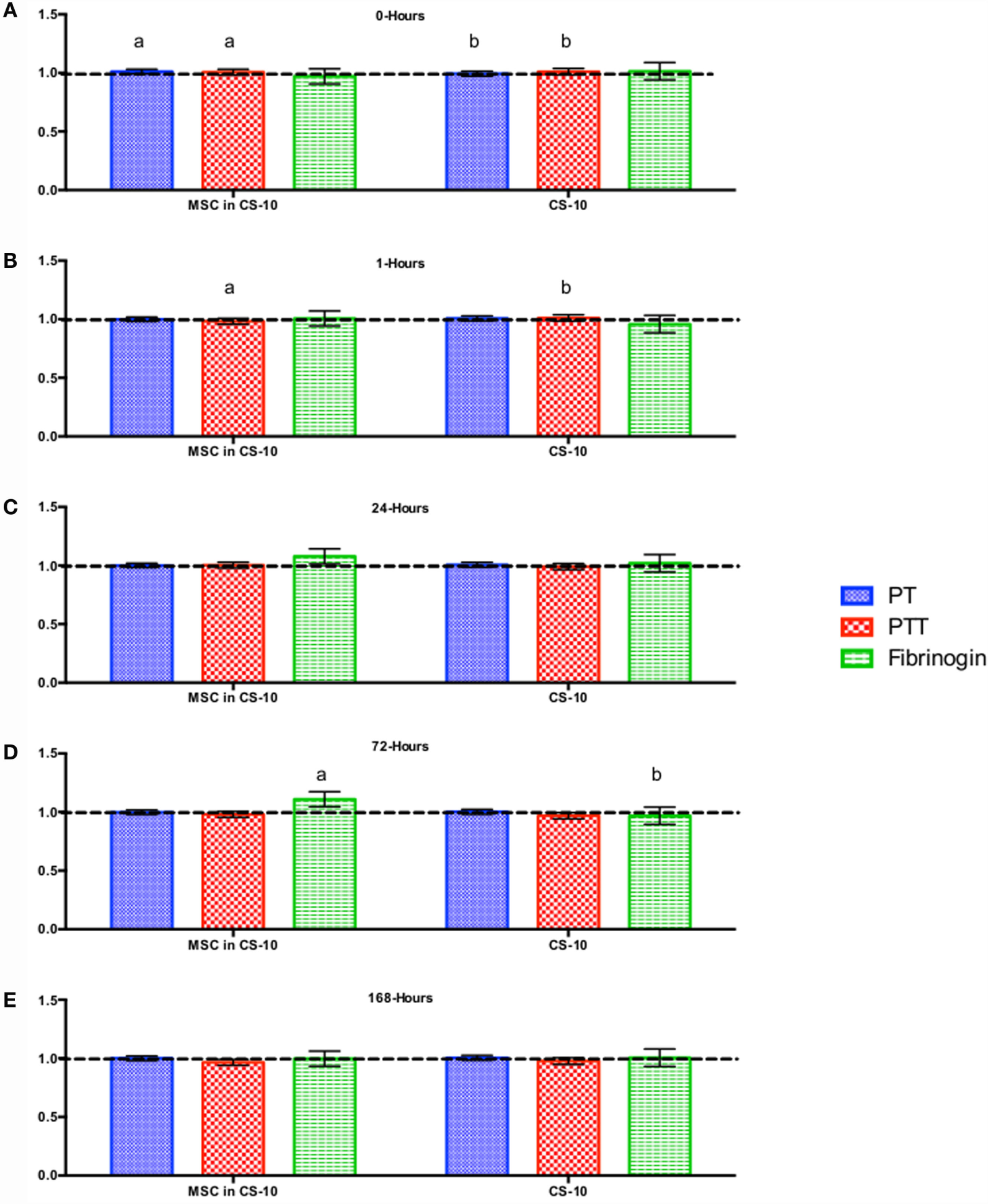 Percent difference from pre-injection measurements (black dotted line) of coagulation profile (A) 0 h, (B) 1 h, (C) 24 h, (D) 72 h, and (E) 168 h following intravenous injection of 5 × 107 pooled allogeneic CB-MSC derived from 5 horses. 10 mL CryoStor® CS10 (CS10) control. Error bars represent 95% confidence interval. Different letters indicate statistical differences between treatment and control groups for a specific parameter.