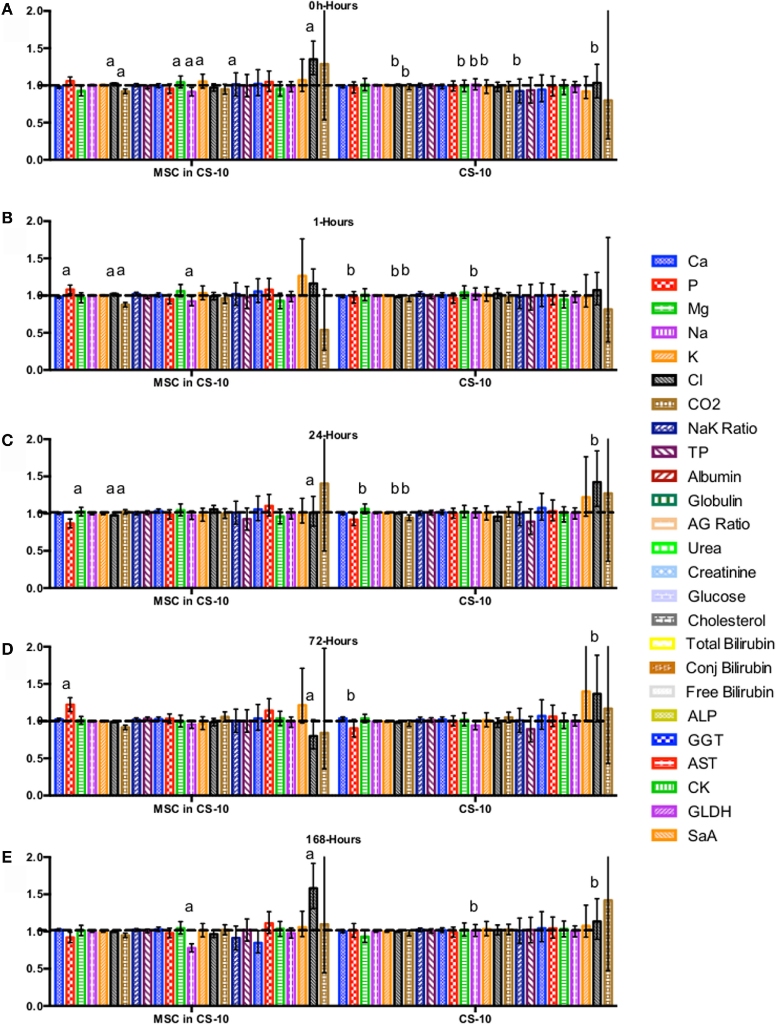 Percent difference from pre-injection measurements (black dotted line) of biochemistry profile (A) 0 h, (B) 1 h, (C) 24 h (D) 72 h, (E) 168 h following intravenous injection of 5 × 107 pooled allogeneic CB-MSC derived from 5 horses. CryoStor® CS10 (CS10) control. Error bars represent 95% confidence interval. Different letters indicate statistical differences between treatment and control groups for a specific parameter.