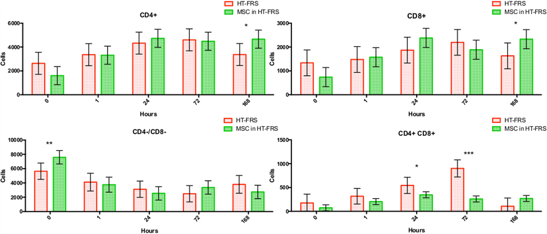 CD4+, CD8+, CD4+/CD8+ (double positive), and CD4−/CD8− (double negative) lymphocyte populations following intravenous injection of 5 × 107 pooled allogeneic CB-MSC derived from five horses. HypoThermosol® FRS (HTS-FRS) control. *p < 0.05, **p < 0.01, ***p < 0.001.