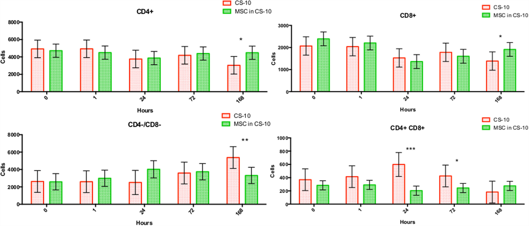CD4+, CD8+, CD4+/CD8+ (double positive), and CD4−/CD8− (double negative) lymphocyte populations following intravenous injection of 5 × 107 pooled allogeneic CB-MSC derived from five horses. CryoStor® CS10 (CS10) control. *p < 0.05, **p < 0.01, ***p < 0.001.