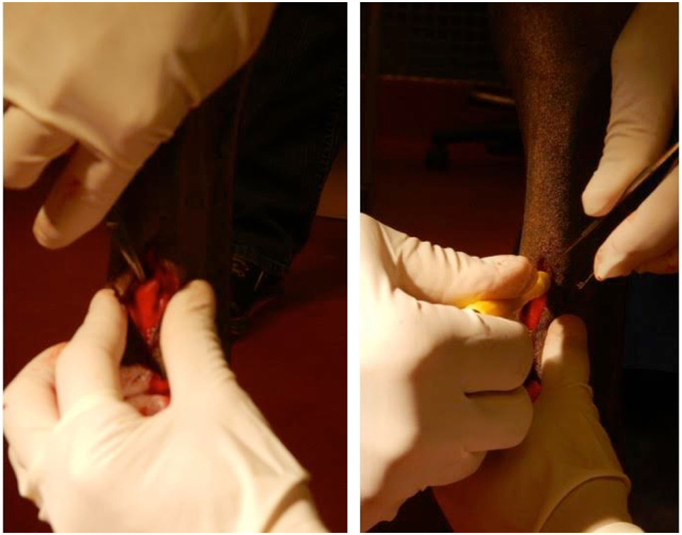 Equine model of peripheral nerve injury. Dissection (left) and transection (right) of the ramus communicans nerve of a fore limb of a horse. A 6-mm diameter biopsy punch was used to transect the center of the nerve.