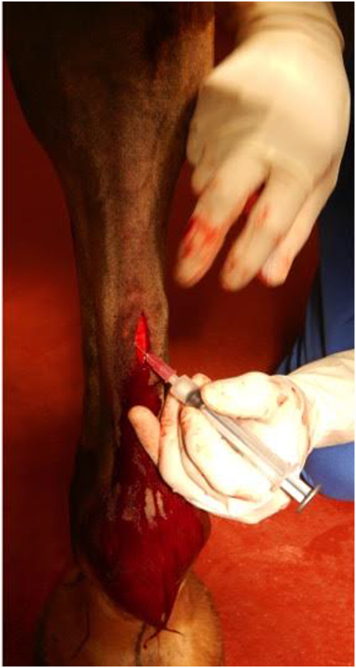 After excising a portion of the ramus communicans of one randomly selected fore limb, 10 × 106 allogeneic, undifferentiated MSCs (from a mare, whose MSCs had been previously characterized), suspended in 1 mL of sterile isotonic saline solution were instilled into the fascia surrounding the medial and lateral stumps of the ramus communicans (Figure 2). The same volume of sterile isotonic saline solution was injected around the stumps of the contralateral nerve (control). The cutaneous incision was closed with staples, and the distal portion of each fore limb was bandaged. The horses received phenylbutazone at the time of surgery (4.4 mg/kg, PO) and the day after surgery (2.2 mg/kg, PO). The limbs were bandaged until the staples were removed on day 14. Bandages were changed every third day.