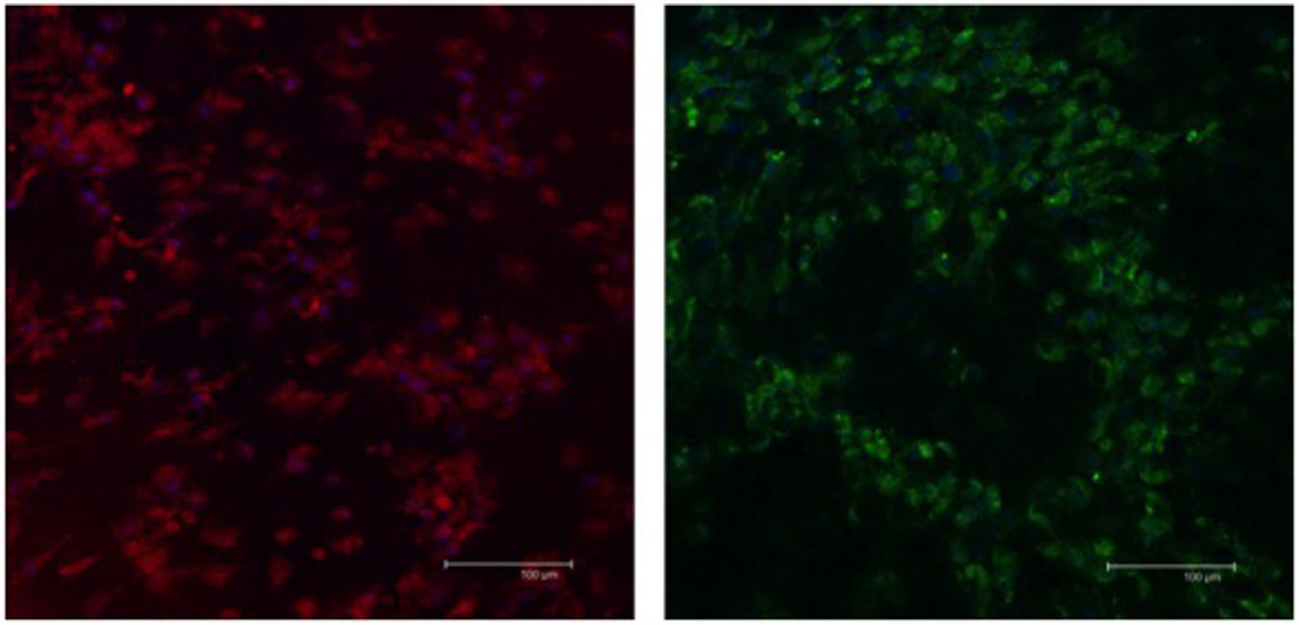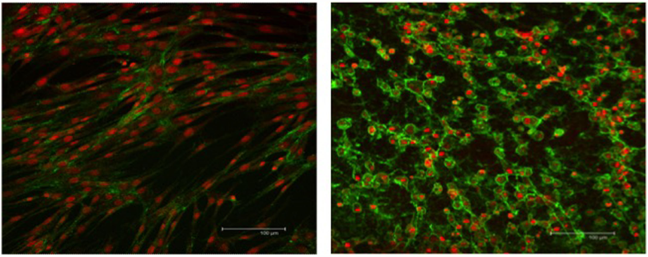 WGA cytoplasmic and TO-PRO-3-iodide nuclear immunofluorescent stains showing the integrity of EBM-MSCs (left) and SLCs (right). Note the typical fibroblast-like morphology of the EBM-MSCs (control), the elongation of the SLCs into a spindle shape, the appearance of one or more cellular processes, and the growth of cells into a “whorl-like” pattern, at day 7. Scale bar = 100 μm.