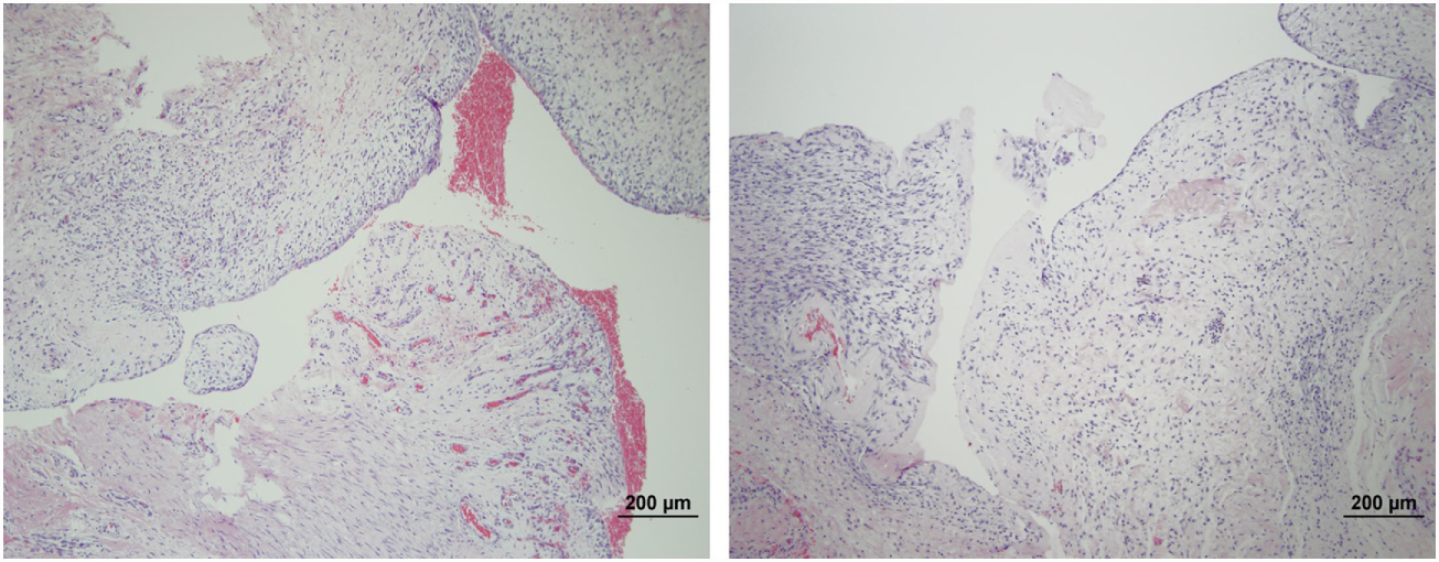 Formation of seromas at the transection sites. Hematoxylin and eosin staining showed all nerves treated with saline solution (left) and MSCs (right) had cleft-like spaces rimmed by or partially filled by aggregates of fibrin overlain or infiltrated by fibroblastic cells and macrophages. 100× magnification.