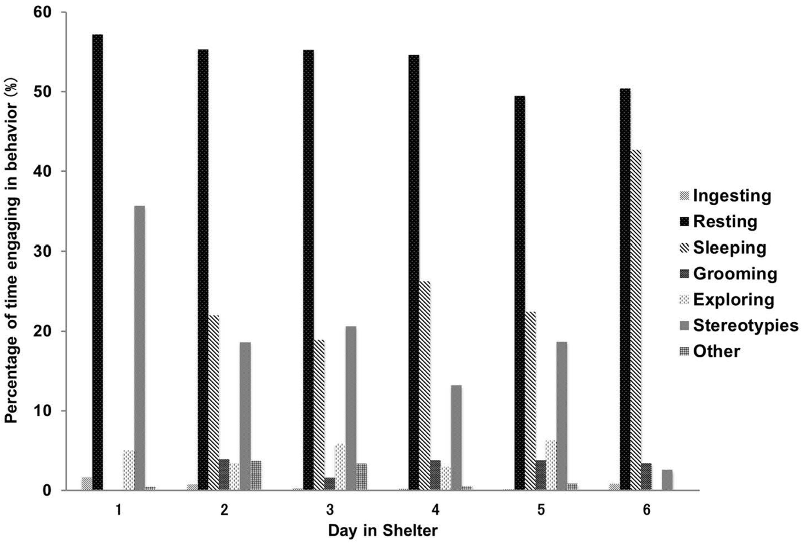 The proportion of behavioral expressions was significantly different between days in shelter (χ2 = 120.36, df = 30, P < 0.001). Behavioral activities that showed a big change during the first 6 days of admittance were stereotypies and sleeping behavior. The former gradually decreased from 35.7% on the first day to 2.6% on the sixth day, and the latter increased from 0.0 to 42.7% (Figure 2).