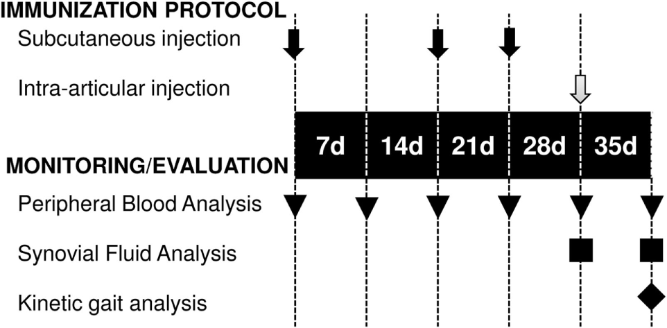 Temporal scheme of the immunization protocol and monitoring. Subcutaneous BSA injections (black arrows), intra-articular injections of BSA or BSA co-administered with exo-mesenchymal stem cells (gray arrow), blood sampling (triangles), synovial fluid sampling (squares), and kinetic gait analysis (rhombus) are shown.