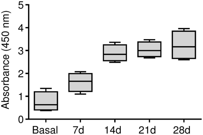 Humoral response in the antigen-induced animal model of synovitis. Plasma samples were weekly collected and anti-BSA IgG levels were quantified by ELISA immunoassay. The lower boundary of the box indicates the 25th percentile and the upper boundary the 75th percentile. Bars above and below the box indicate the 90th and 10th percentiles. The line within the box marks the median (n = 4).