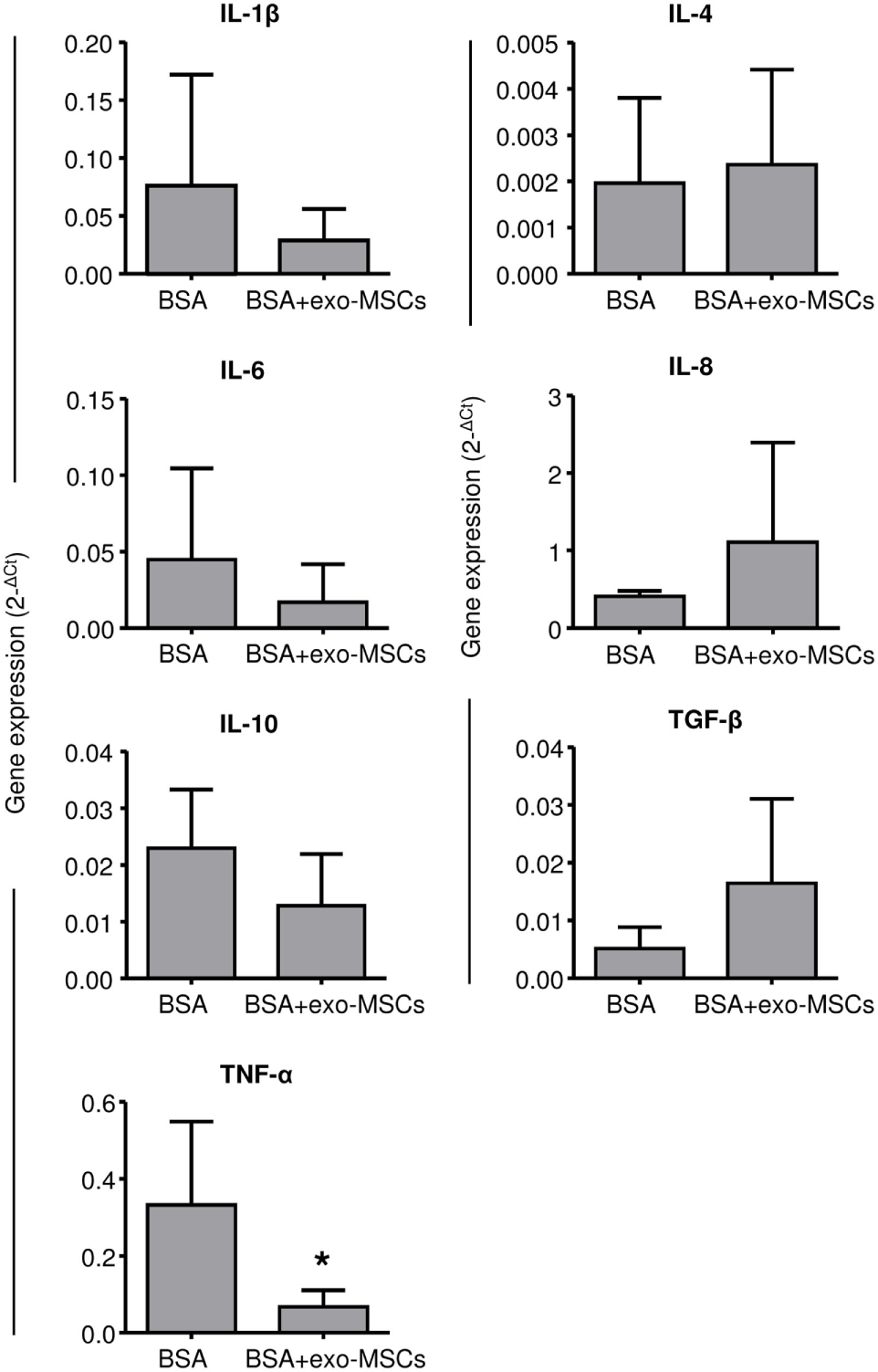 Once evaluated, the changes in the leukocyte counts as well as in the synovial lymphocytes, we aimed to evaluate the inflammatory environment by quantifying inflammatory cytokines by quantitative RT-PCR. Porcine-specific primers were designed to amplify IL-1β, IL-4, IL-6, IL-8, IL-10, TNFα, and TGF-β. As shown in Figure 3, the 2−ΔCt values were compared between SFs where BSA was co-administered with PBS and SFs where BSA was co-administered with exo-MSCs. No differences were found in 7 out of 8 cytokines; however, a significant decrease (p = 0.05) was found for TNF-α when BSA was co-administered with exo-MSCs.
