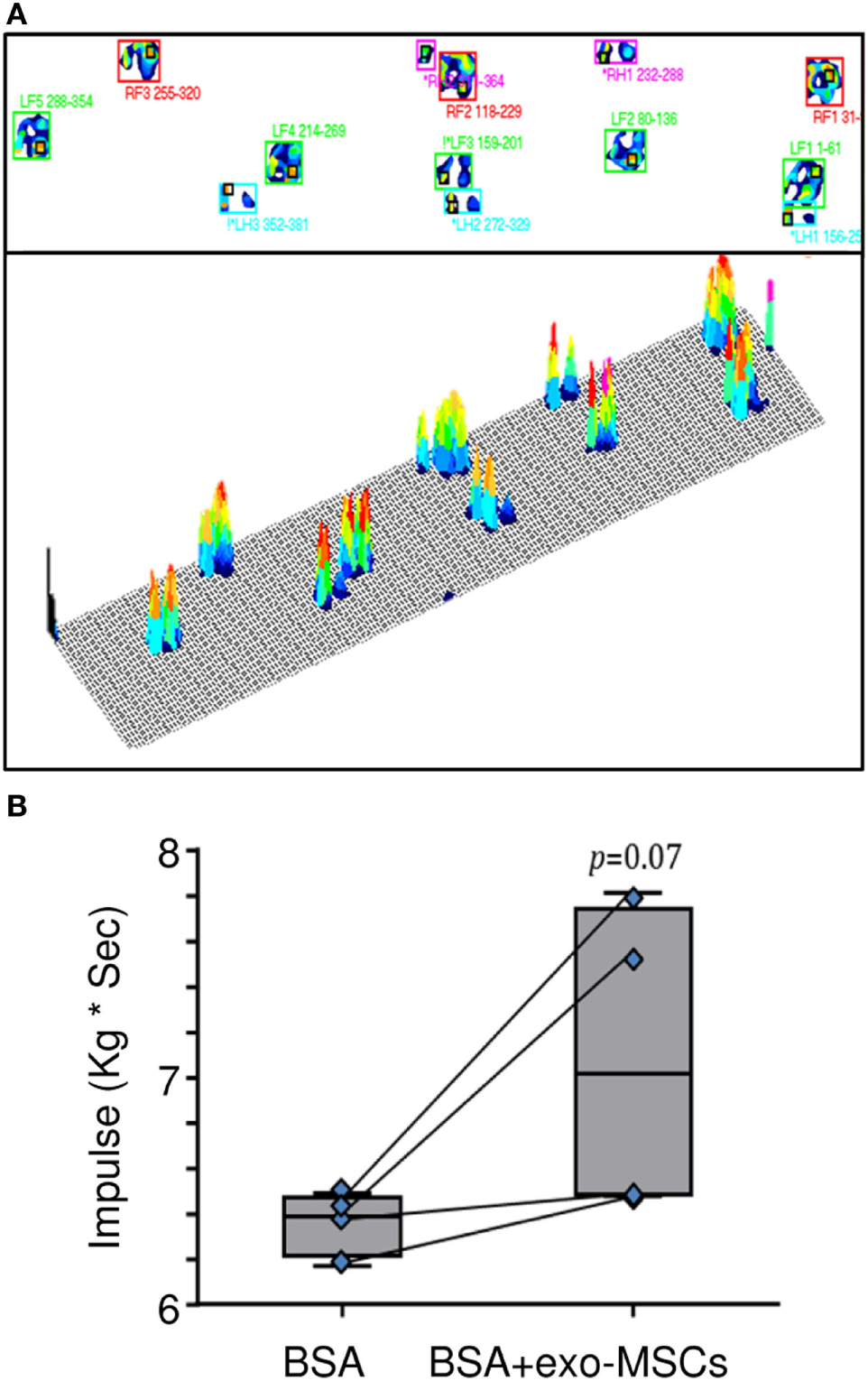 Pressure platform (PP) gait analysis. Then, 7 days after intra-articular injections of BSA or BSA co-administered with exo-mesenchymal stem cells (MSCs), a PP gait analysis was performed to evaluate plantar pressure distributions. (A) A representative image of the gait analysis (LF, left forelimb; LH, left hind limb; RF, right forelimb; RH, right hind limb) is represented. (B) Impulses in forelimbs with intra-articular BSA co-administered with PBS or exo-MSCs (n = 4). The lower boundary of the box indicates the 25th percentile and the upper boundary the 75th percentile. Bars above and below the box indicate the 90th and 10th percentiles. The line within the box marks the median. Measurements compared in a paired t-test.