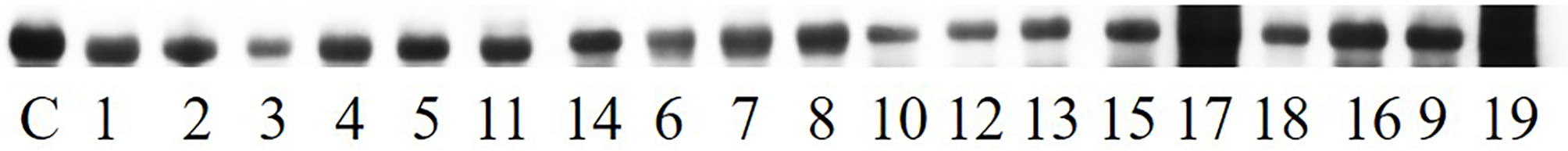 Results obtained with WB on samples collected from healthy dogs (lanes 1–4) and from clinically sick dogs (5–19). The control sample (serum oxidized with CSE) has been loaded on lane C. Dog serum proteins has been separated in SDS-PAGE, transferred to PVDF membrane and immunodetected with specific antibodies.
