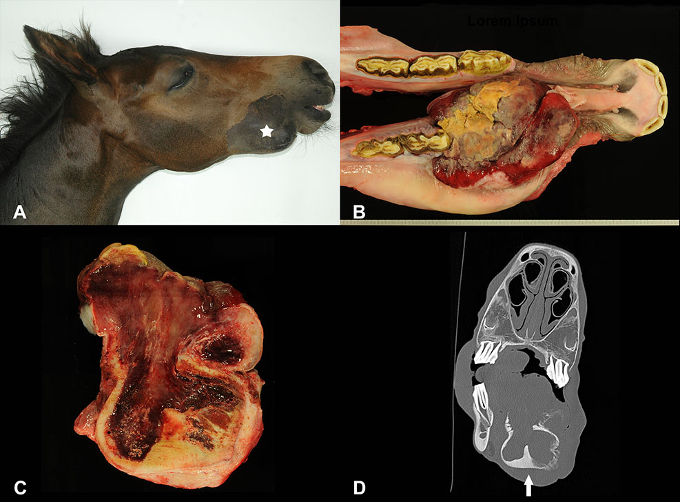 Swelling on the right mandible (A; white star) of a foal, showing extensive growth and consecutive loss of the first deciduous premolar (B). The cut surface was reddish and of gelatinous consistency (C). Transverse CT image of the oral mass involving the right mandible (D; arrow).