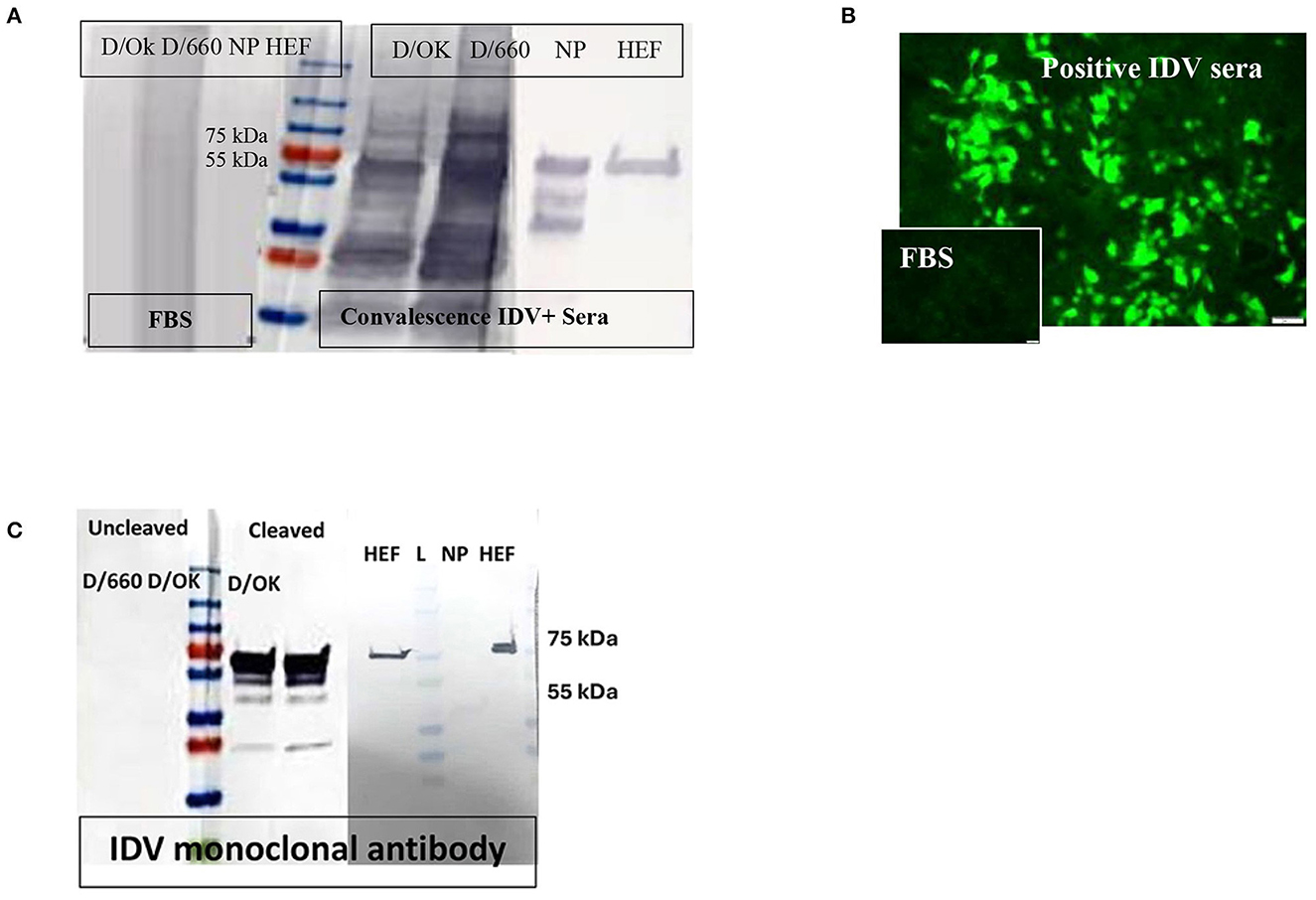 Rabbit polyclonal primary antibodies (IgG) against IDV D/660 and D/OK were used as controls to study the cross-reactivity between clades D/660 and D/OK, which are antigenically different. Monoclonal antibodies generated in our laboratories against D/660 were also used. Cross-reactivity between the two lineages was evaluated by WB and IFA of the mammalian expression system of the HE protein.