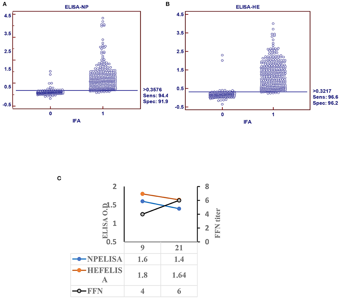 Figure 2. Indirect ELISA specific for IDV (iELISA). (A) Receiver operator characteristics (ROC) and diagnostic sensitivity and specificity of IDV-NP. (B) ROC analysis and diagnostic sensitivity and specificity of IDV-HE (MedCalc version 11.1.1.0, MedCalc software, Mariakerke, Belgium) In each panel, dot plot on the left and right denote negative and positive testing populations, respectively. The horizontal line bisecting the dot plots denotes the cutoff value for optimal diagnostic sensitivity and specificity. (C) Seroconversion of IDV in infected calves using ELISA-based NP, HE, and FFN in calves experimentally infected with IDV.