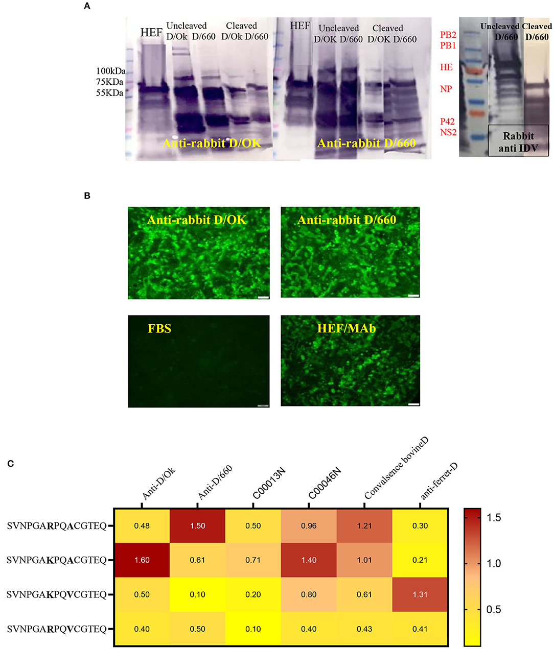 Figure 3. Cross-reactivity between two IDV different clades of D/660 and C/OK. (A) Cross-reactivity between the two IDV different clades of D/660 and C/OK using specific polyclonal rabbit anti-IDV sera against each clade and using polyclonal rabbit anti-IDV/D/660 and polyclonal rabbit anti-IDV/C/OK sera against cleaved and non-cleaved viruses. (B) Cross reactivity of the mutant HE protein at the site 212 amino acid. MDCK cells were stained with both IDV lineages of anti-rabbit-sera and mAb after transfection in MDCK cells. (C) List of peptides used and recognition of both D/OK and D/660 antibodies.