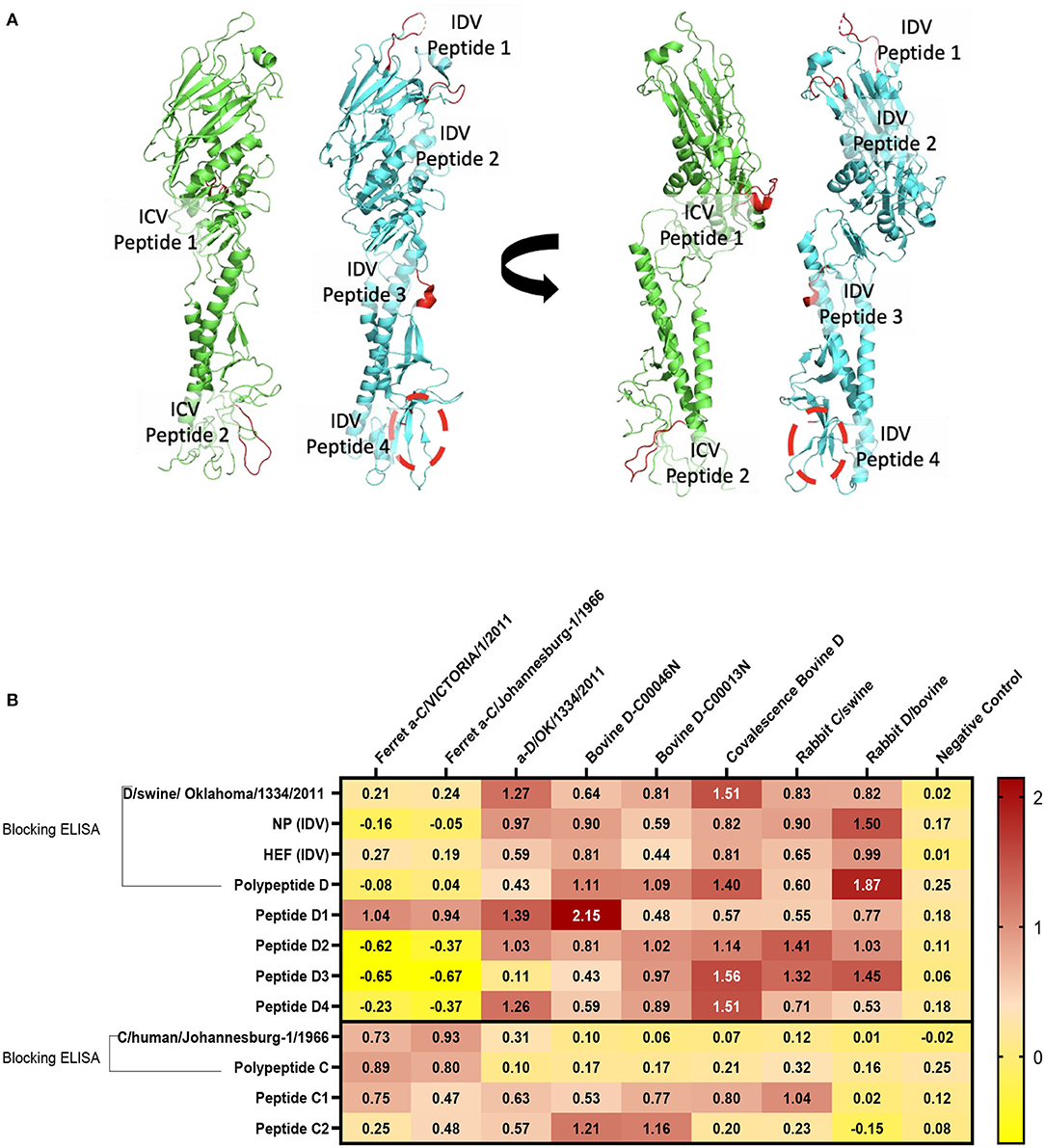 Figure 4. Differentiation between IDV and ICV. (A) Structural representation of the haemagglutinin esterase fusion glycoprotein from the influenza C virus in green (PDB:1FLC) and the influenza D virus in blue (PDB:5E64). Peptides of interest are represented in red. ICV peptide one is found in esterase domain one and has the sequence RTDKSNSAFPRSAD. ICV peptide two is found in fusion domain two and has the sequence GSRKESGGGVTKES. IDV peptide one is found in the receptor domain and has the sequence AESSVNPGAKPQVCGT. IDV peptide two is also found in the receptor domain and has the sequence IANAGVK. IDV peptide three is found in the fusion domain and has the sequence KTDSGR. An enzymatic cleavage site was noted adjacent to IDV peptide three. IDV peptide four falls within a 17 amino acid region not represented in structural data. Its location is highlighted with a dashed circle. IDV peptide four has the sequence RTLTPAT and occupies the fusion domain. (B) NP, HEF, and IDV antigens were blocked by anti-ICV antibodies. ICV was blocked by anti-IDV antibodies. Compared to blocking ELISA, polypeptides and single peptide ELISA had higher sensitivity and specificity of peptides to differentiate between IDV and ICV.