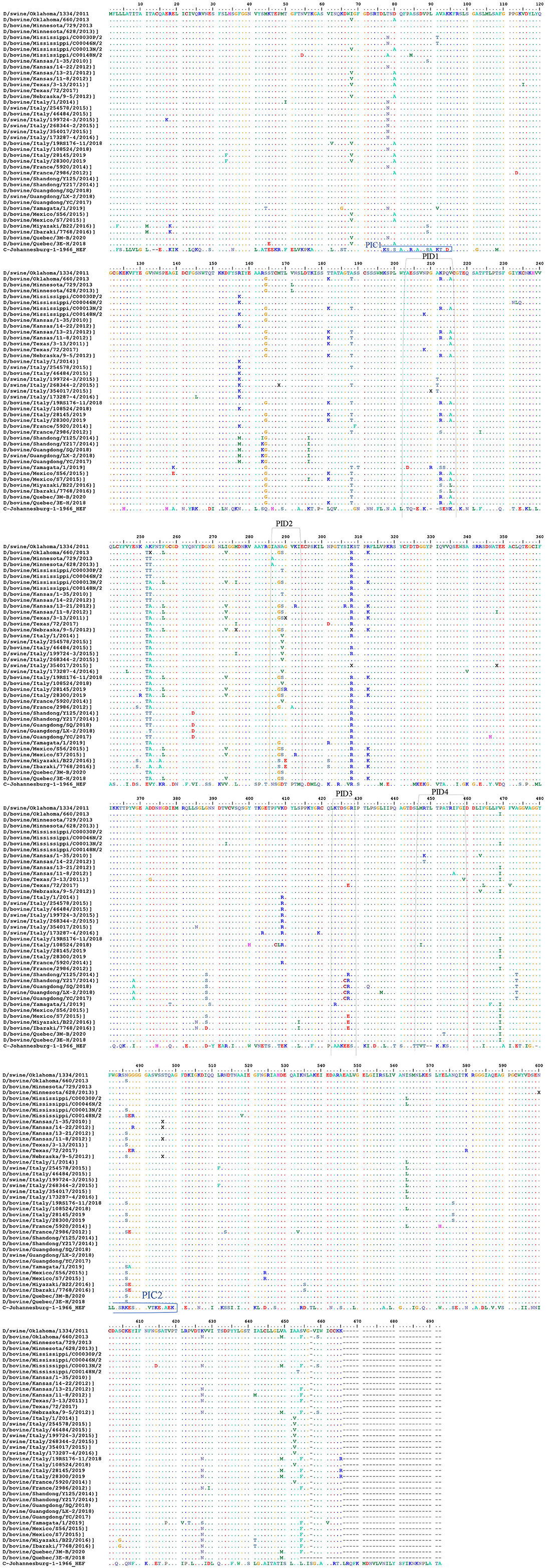 Representation of the IDV HEF protein including the four IDV peptides of the strain in our study. The IDV Peptides showed more similarities to the European strains than of the Asian. The two clades IDV virus led sequence are cataloged with other virus sequences from the blast then an alignment using Bio edit program has been done. As part of this process, we compared the ICV sequence with the other virus sequences and looks for differences among them to visually represent how genetically different the Peptides are from each virus strain to other (Figure 5 and Supplementary Materials 1, 3). PID1 showed a 100% similar to (D/bovine/Guangdong/SQ/2018), (D/swine/Guangdong/LX-2/2018), (D/bovine/Guangdong/YC/2017), (D/bovine/Shandong/Y125/2014), (D/bovine/Shandong/Y217/2014), (D/bovine/Guangdong/SQ/2018) (D/bovine/France/5920/2014), (D/bovine/Italy/108524/2018), (D/swine/Italy/173287-4/2016), (D/swine/Italy/268344-2/2015), (D/bovine/Italy/46484/2015) and (D/swine/Italy/254578/2015) (Figure 5 and Supplementary Material 3), while PID2 showed 100 % similarities to (D/bovine/Guangdong/SQ/2018), (D/swine/Guangdong/LX-2/2018), (D/bovine/Guangdong/YC/2017), (D/bovine/Shandong/Y125/2014), (D/bovine/Shandong/Y217/2014), (D/bovine/Guangdong/SQ/2018), and (D/swine/Italy/354017/2015) (Figure 5 and Supplementary Material 3). PID3 showed 100 % similarities with (D/bovine/Quebec/3E-H/2018), (D/bovine/Quebec/3M-B/2020), (D/bovine/Mexico/S56/2015), (D/bovine/France/5920/2014), (D/bovine/France/2986/2012), (D/bovine/Italy/108524/2018), (D/swine/Italy/173287-4/2016), (D/bovine/Italy/46484/2015), (D/swine/Italy/254578/2015), (D/swine/Italy/354017/2015), (D/bovine/Italy/28300/2019), (D/bovine/Italy/28145/2019), (D/bovine/Italy/19RS176-11/2018), (D/swine/Italy/199724-3/2015), and (D/bovine/Italy/1/2014), while it showed 90% to (D/bovine/Yamagata/1/2019).