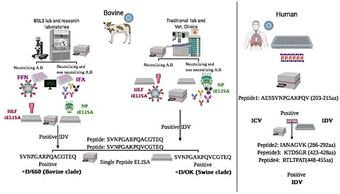 In conclusion, our study and the assays we have developed will play key roles in seroprevalence studies, surveillance, diagnosis of IDV, and vaccine evaluation (graphical abstract and Table 2). Also, our new diagnostic tests will play a critical role in vaccine evaluation. The indirect HE ELISA and FNN showed the possible replacement of the HI test by HE based iELISA and FFN. Our IDV tissue culture–based assays IFA and FFN are important for research labs and vaccine evaluation, and our NP-iELISA and/or HEF-iELISA can be used in clinical laboratories lacking BSL2 facilities. Peptide-iELISA of the two IDV lineages highlighted the importance of position 215 with 212 in the zoonotic importance of IDV and the heterogeneity between the two lineages. Blocking ELISAs and IDV peptides IANAGVK (286-292aa), KTDSGR (423-428aa), and RTLTPAT (448-455aa) will be a great tool to differentiate between IDV and ICV in human samples. The two IDV's lineage peptides-iELISA highlighted the importance of position 215 with 212 in the zoonotic importance of IDV and the heterogeneity between the two lineages.