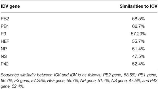 Table 3. IDV similarities to ICV IDV shares 50% amino acid sequence identity with ICV, lacks the neuraminidase gene, and has seven genes instead of eight seen in IAV and IBV (4).