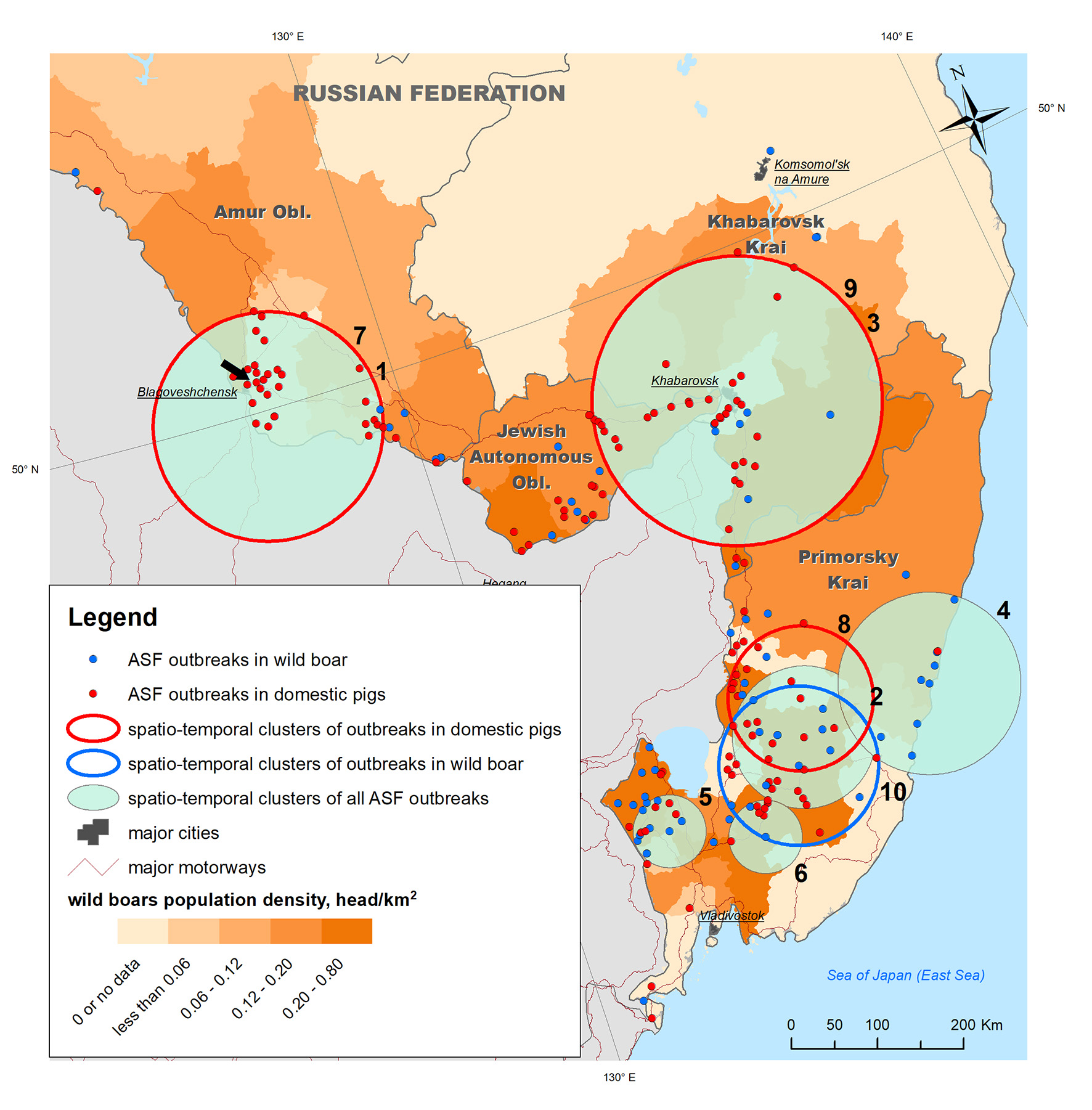 The observed pattern of the ASF outbreaks' clustering within the study area likely reflects the multiple ways through which the virus may have entered this region. The initial spread started simultaneously in two distant parts of the study region (Primorsky Krai and Amur Oblast) and resulted in a large epidemic involving both DP and WB. The current epidemic situation demonstrates a predominance of DP outbreaks in Amur Oblast, Jewish Autonomous Oblast and Khabarovsk Krai. These outbreaks are mainly concentrated along the Russian—Chinese border and main transportation routes with just several cases of ASF in WB that do not influence the outbreak clustering patterns in these three regions. In contrast, Primorsky Krai shows a mixture of ASF outbreaks both in WB and DP, which are widely spread across its area.