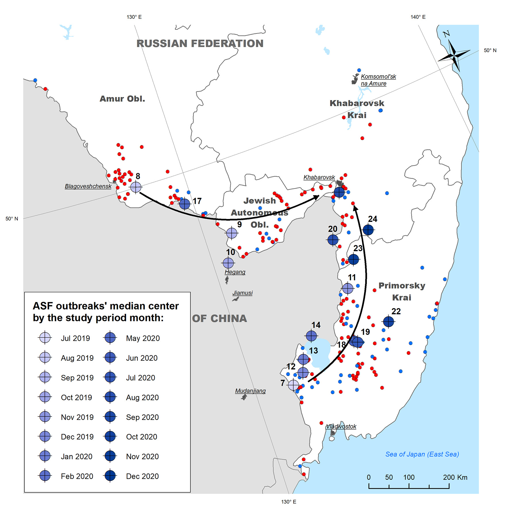 Zakharova OI, Titov IA, Gogin AE, Sevskikh TA, Korennoy FI, Kolbasov DV, Abrahamyan L and Blokhin AA (2021) African Swine Fever in the Russian Far East (2019–2020): Spatio-Temporal Analysis and Implications for Wild Ungulates. Front. Vet. Sci. 8:723081. doi: 10.3389/fvets.2021.723081